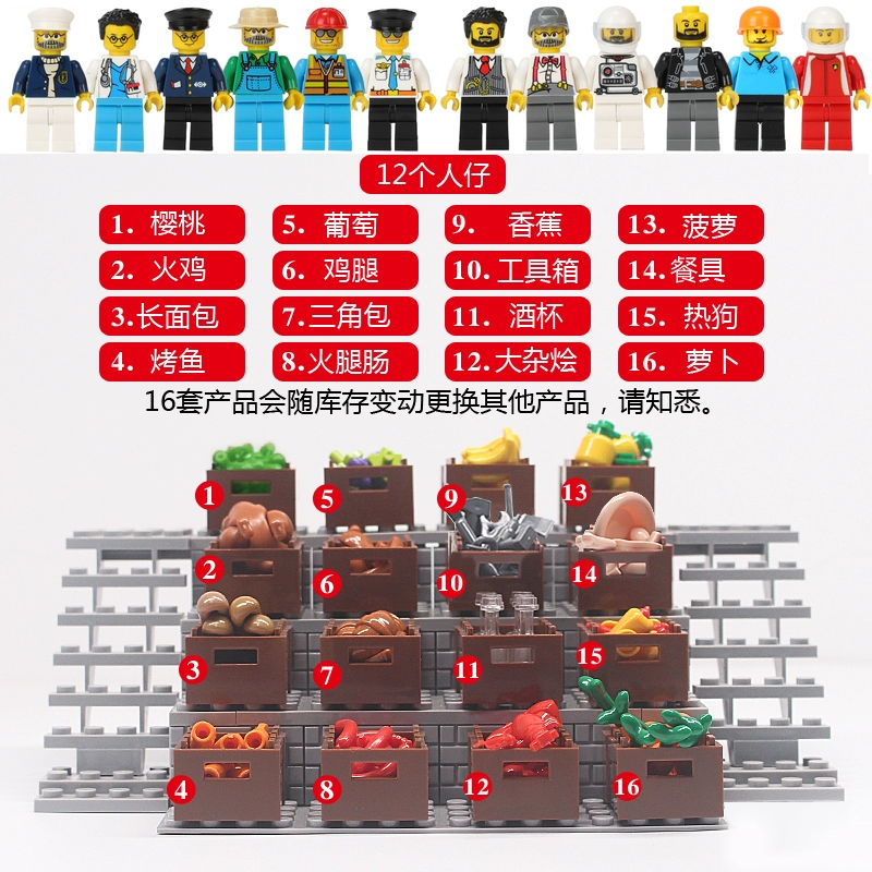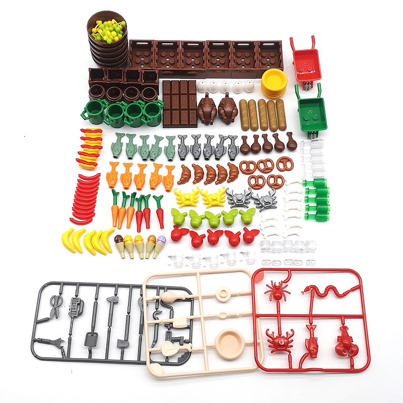 | nameOriginal | Small particle DIY assembled building blocks combination food seafood wine bottle bread dessert fruit box display stand MOC toys |
