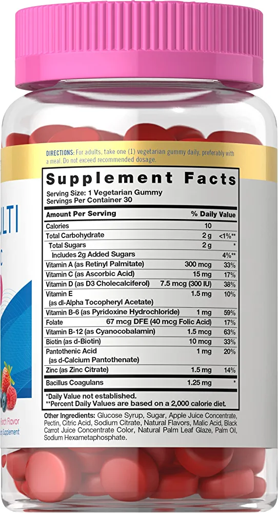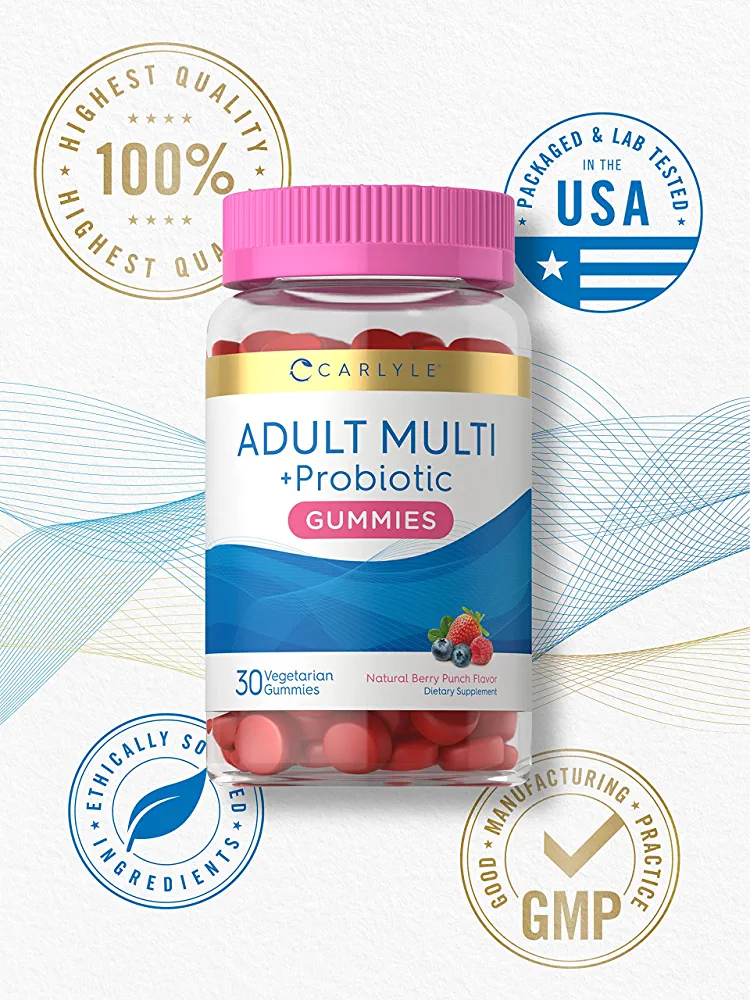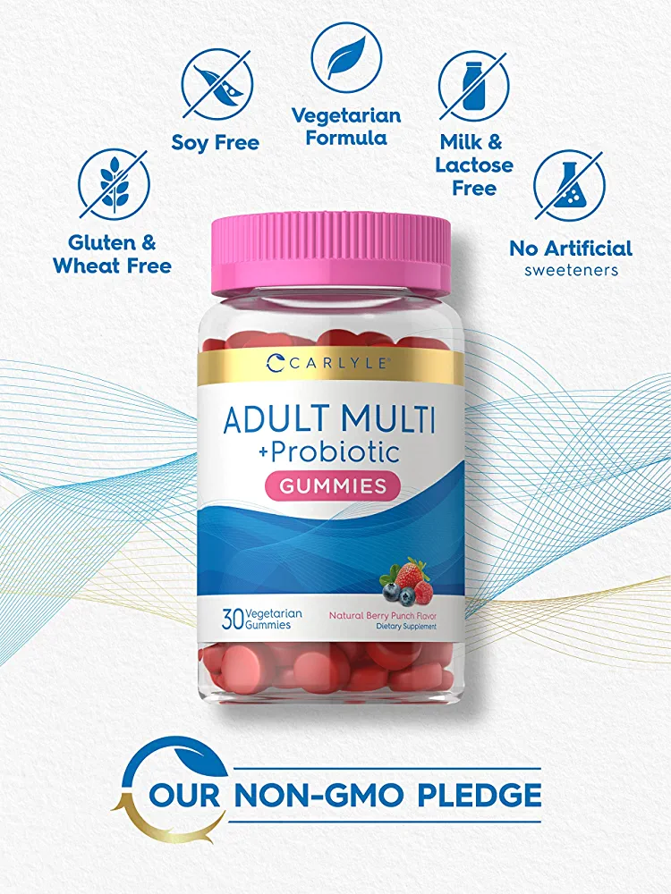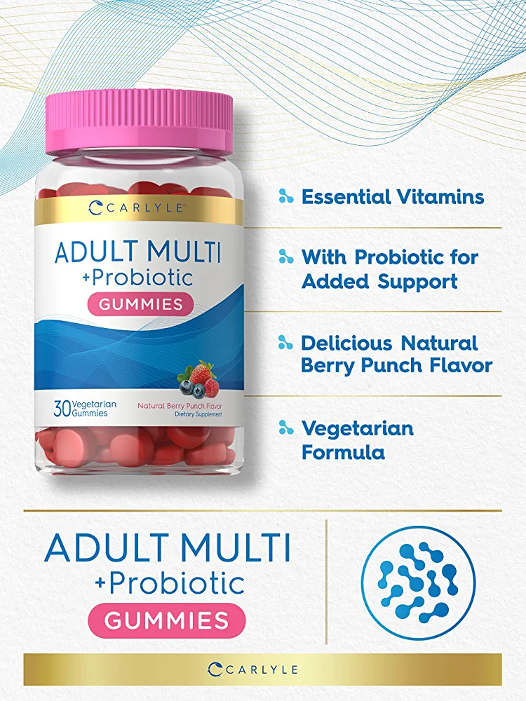 | nameOriginal | Carlyle Adult Multivitamins Gummies, with Probiotic, 30 Count, Berry Punch Flavor, Vegetarian, Non-GMO, Gluten Free Supplement |