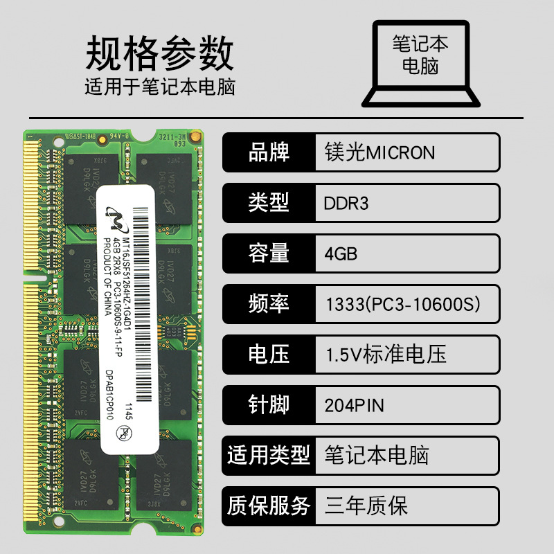| nameOriginal | Magnesium light DDR3 4G 1333MHZ PC3-10600 laptop memory bar MT16JTF25664A |