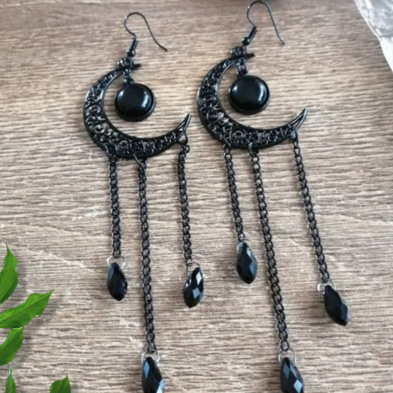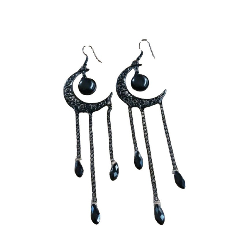 | nameOriginal | Amazon Cross Border Gothic Halloween Hollow Black Tassel Long Crystal Moon Earrings Ear Hook Earrings |