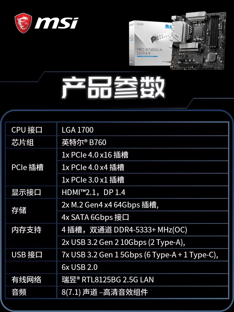 | nameOriginal | MSI/MSI Frost Armor PRO B760M-A DDR4 II gaming motherboard brand new and unopened |
