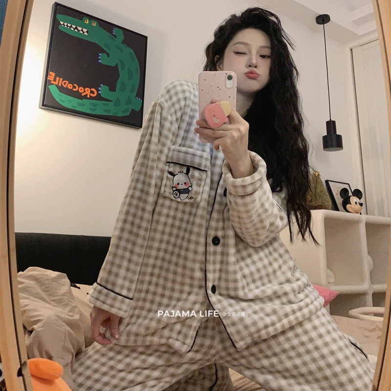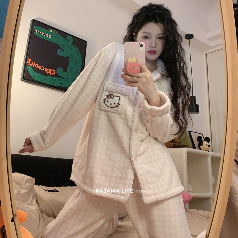 | nameOriginal | Cute Cartoon Kuromi Pajamas for Women Autumn and Winter Coral Fleece Warm Plus Velvet Flannel Plaid Home Clothing Set |