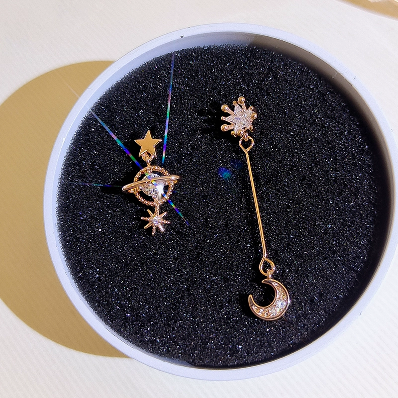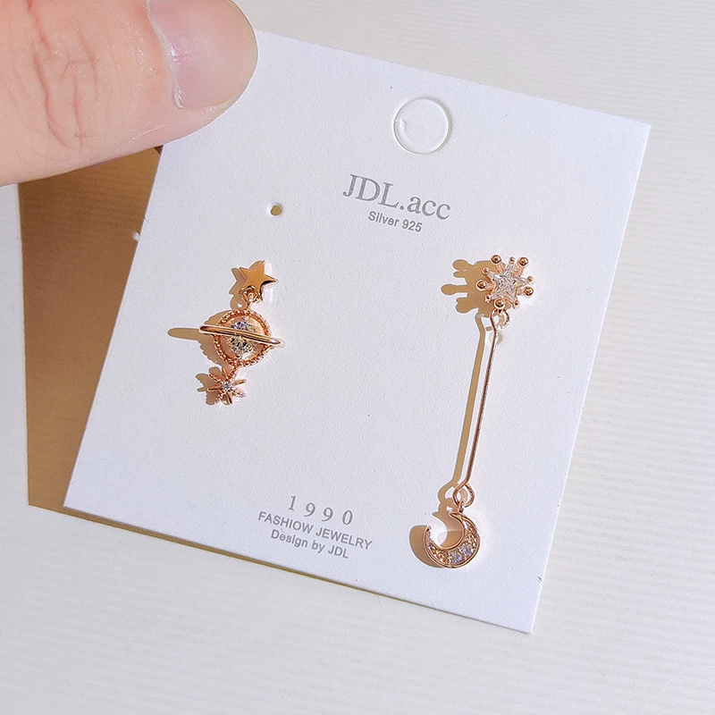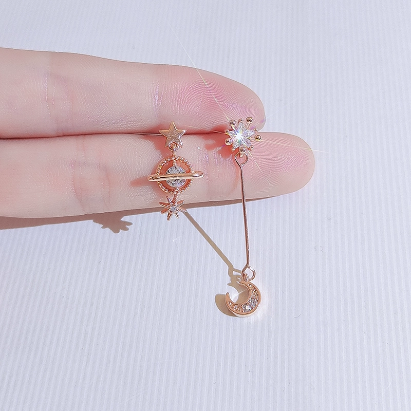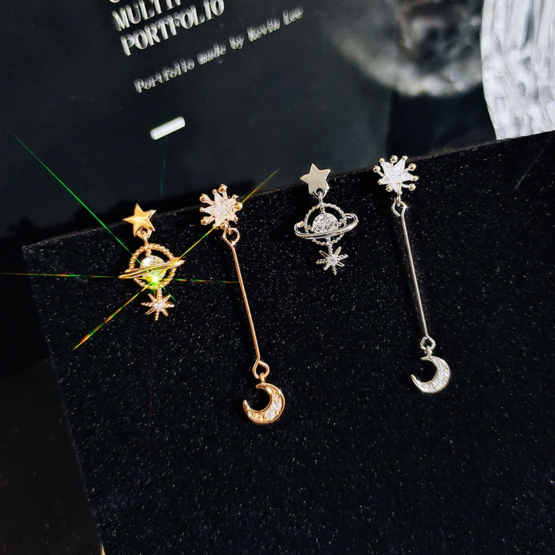 Asymmetrical star and moon ear clips without piercing female Internet celebrity earrings small fresh earrings 925 silver needle earrings long earrings