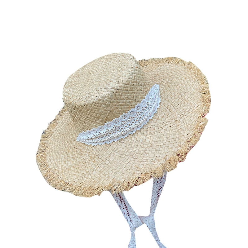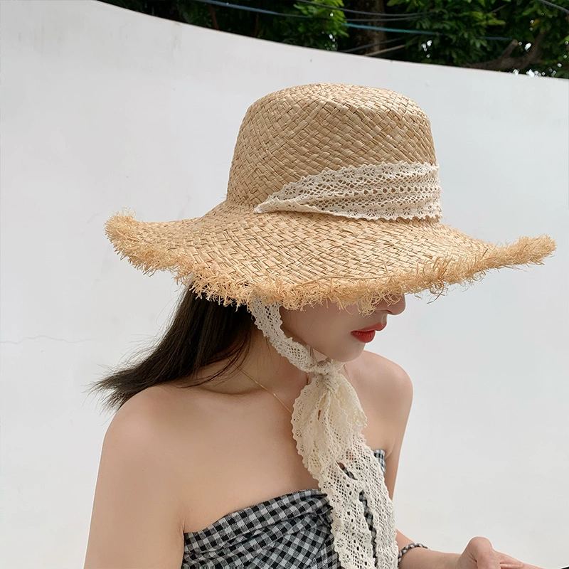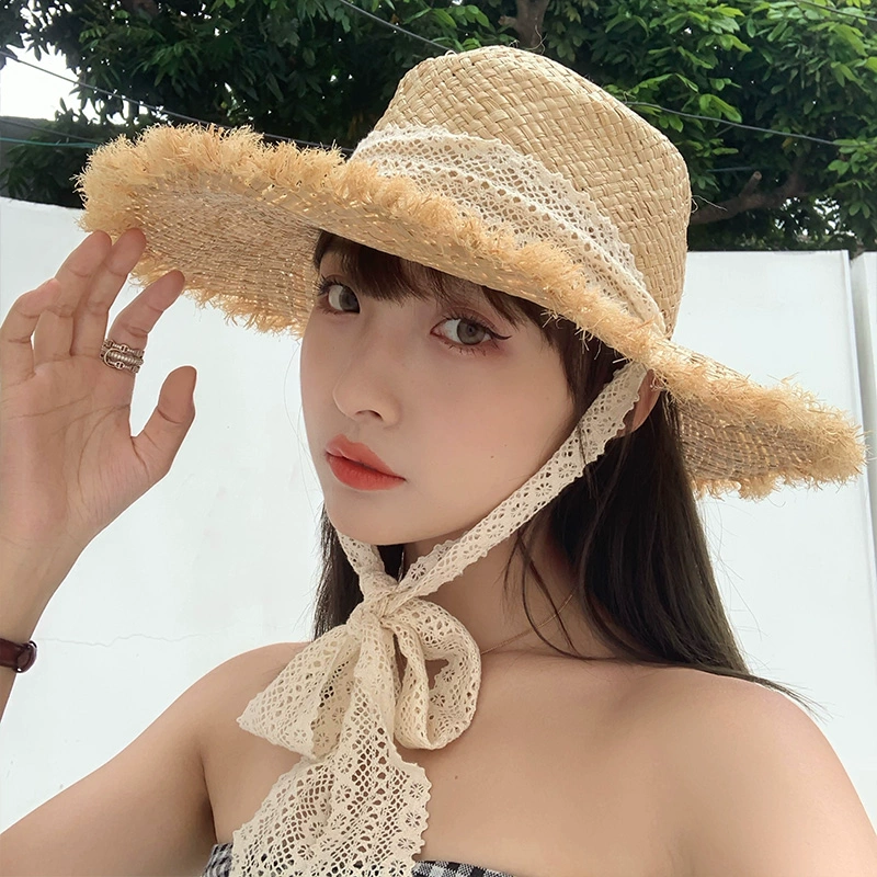 | nameOriginal | Lace raffia woven flat-top straw hat summer Japanese style raw edge sun protection seaside beach lace sun visor |