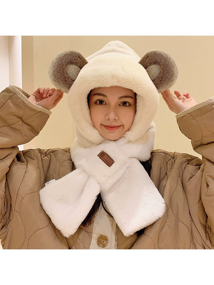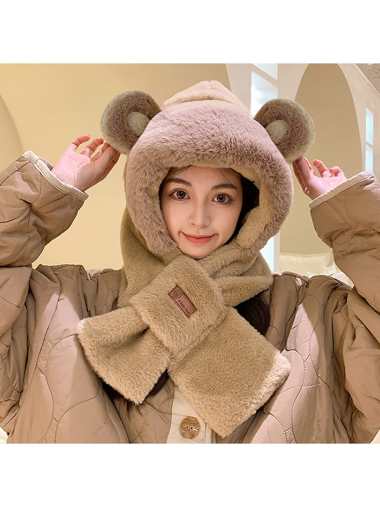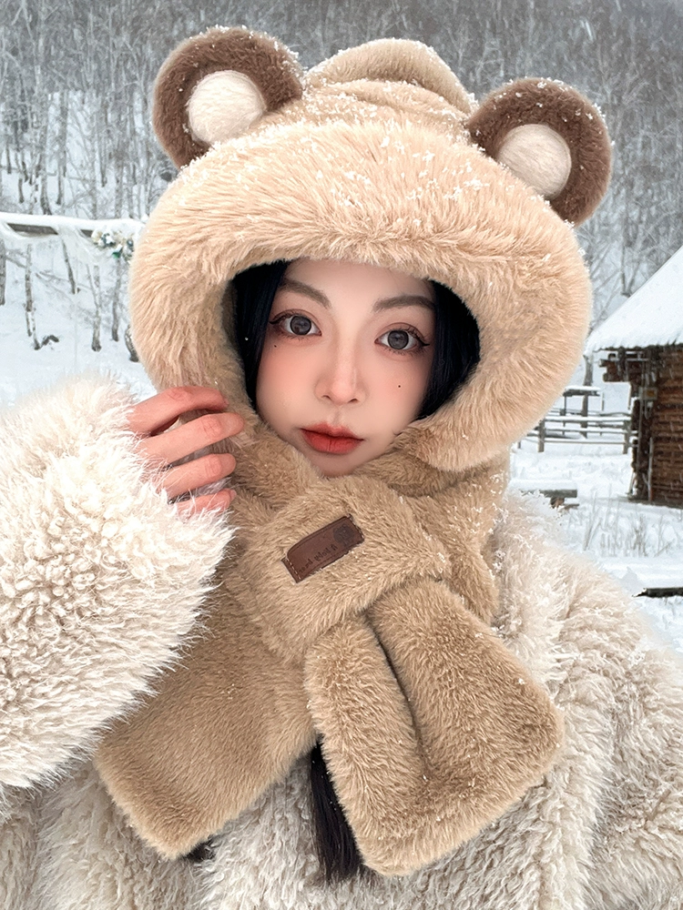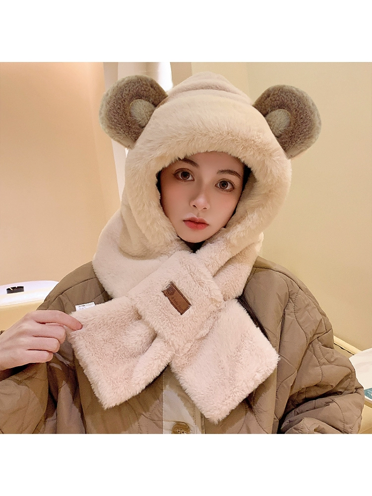 | nameOriginal | Plush bear hat scarf all-in-one women's 2024 new autumn and winter gloves hooded neck scarf cycling three-piece set |