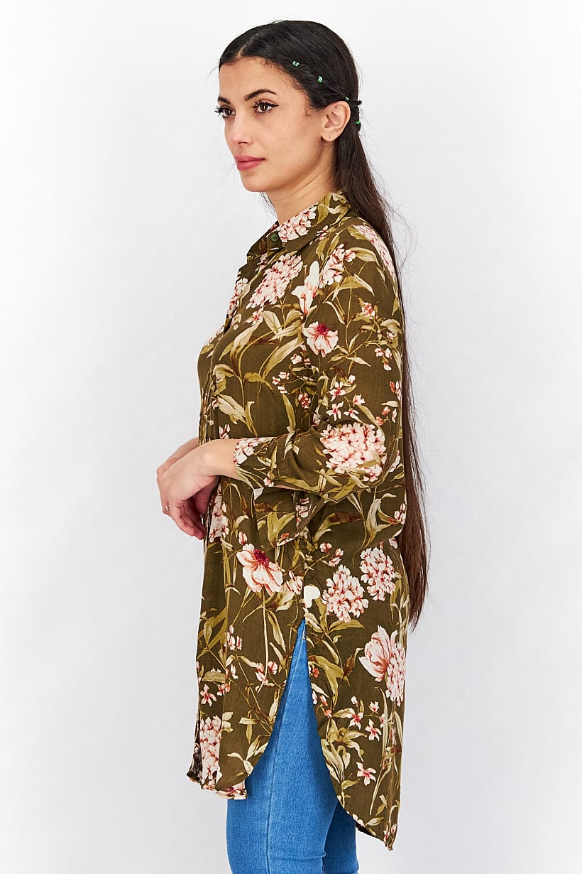 This blouse is designed for a comfortable regular fit and is machine washable for easy care. It features a spread collar and long sleeves with a button closure. The curved hem adds a stylish touch, while the olive color and floral print make it perfect for casual occasions. Please note that the product color may vary slightly due to lighting or monitor settings. Made from 100% viscose fabric, this blouse is a great addition to your wardrobe.