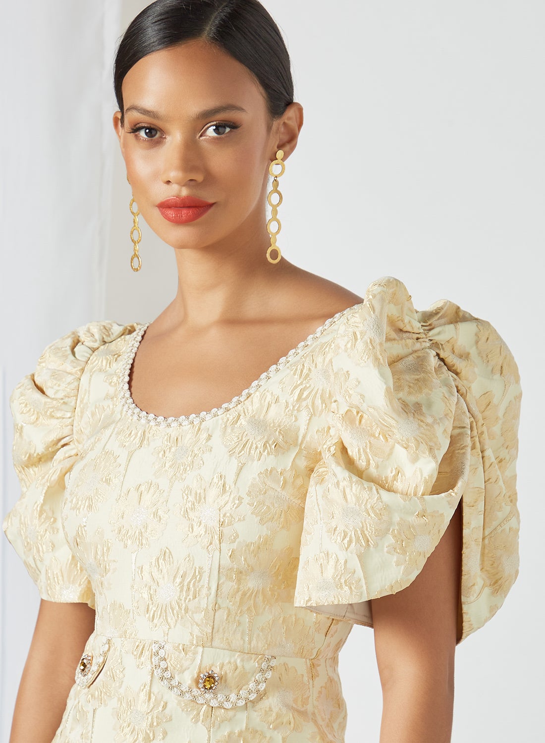 This product features a jacquard fabric made of textured polyester, with a beautiful metallic floral pattern all over. It has a round neckline and puffed sleeves, with an embellished flap detail on the front. The reverse side has a secure zipper closure. Please follow the care label instructions when washing.