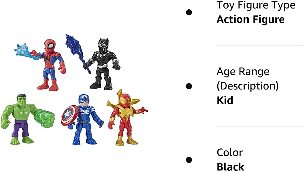 | nameOriginal | Super Hero Adventures Playskool Heroes Marvel 5-Inch Action Figure 5-Pack, Includes Captain America, Spider-Man, 5 Accessories (Amazon Exclusive) |