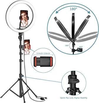 | descriptionOriginal | Tycom 10-inch Selfie Ring Light with Tripod Stand and Phone Holder Providing perfect lighting solution for Video Recording/Make-up/Live Streaming/Online Class/Selfie Wide Application 1 x 10" Ring Light 1 x Tripod Stand 1 x Phone Clip 1 x Extra Phone Holder 1 x Gopro Adapter 1 x Portable Pouch 3 Colors Lighting Modes: warm light, nature light and white light. Color Temperature: 3000K-6000K Outer Diameter: 10 inches Dimmable: Yes Dimming range: 10%-100% Height Adjustable Tripod Stand: 70cm-210cm Tripod Weight: 0.5 kg Flexible Phone Holder: Extending Size: up to 3.6" |
