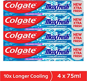 | descriptionOriginal | Breathe confidently with this unique gel toothpaste formula and enjoy the powerful rush of freshness unleashed by its cooling crystals, for 10 times longer-lasting fresh breath*. Plus, Colgate Max Fresh with Cooling Crystals fights cavities and has an intense minty flavor** leaving you with a healthy smile. * vs. Colgate's ordinary fluoride toothpaste ** vs. previous formula Enjoy the toothpaste’s dissolvable cooling crystals in the unique blue gel formula. Burst of freshness to your entire mouth for 10 times longer-lasting fresh breath Intense cool mint flavor. Fights cavities with fluoride formula to make your teeth stronger and healthier Colgate MaxFresh Cool Mint Gel Toothpaste – 4 x 75 ml Colgate MaxFresh Clean Mint Gel Toothpaste – 4 x 75 ml |