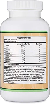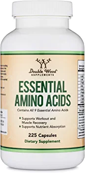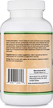 | nameOriginal | Essential Amino Acids – 1 Gram Per Serving Powder Blend of All 9 Essential Aminos (EAA) and all Branched-Chain Aminos (BCAAs) (Leucine, Isoleucine, Valine) 225 Capsules by Double Wood Supplements |