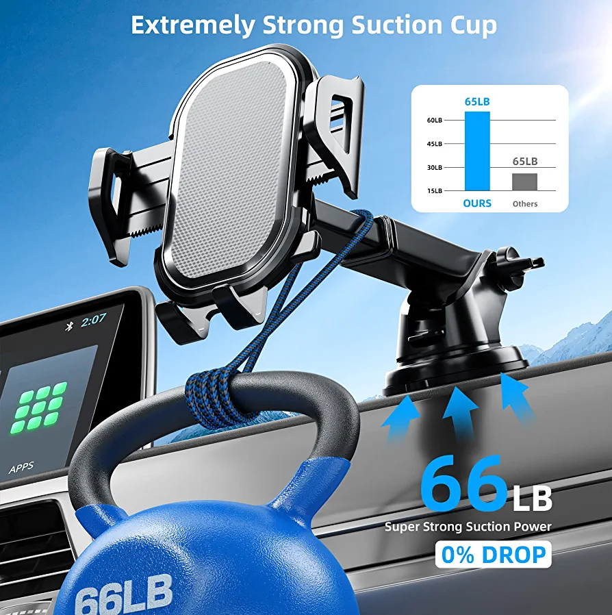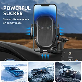 Improved Suction Cup: The phone mount is equipped with a double-locking suction cup and uses heat-resistant material, which can provide strong suction power on smooth surfaces, and keep the holder stable under all conditions. To restore the grip, simply rinse the sticky surface with hot water and wipe it off