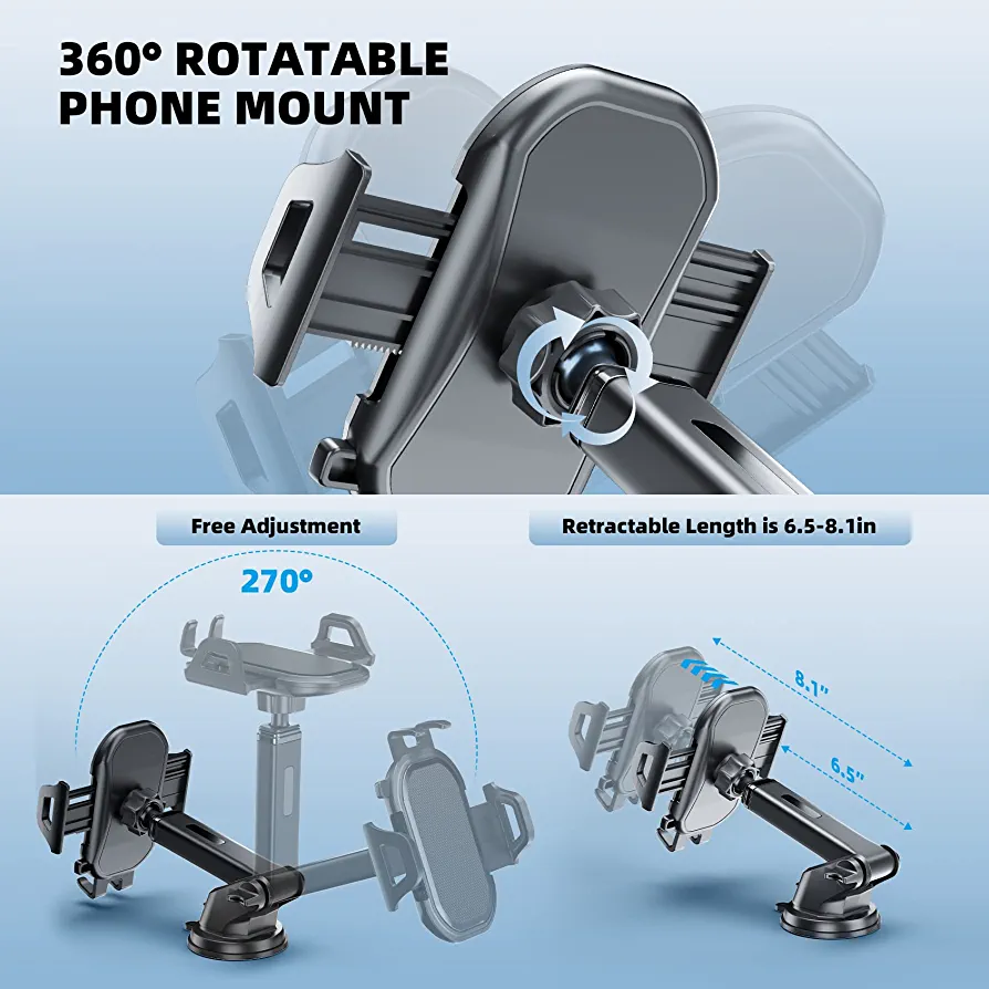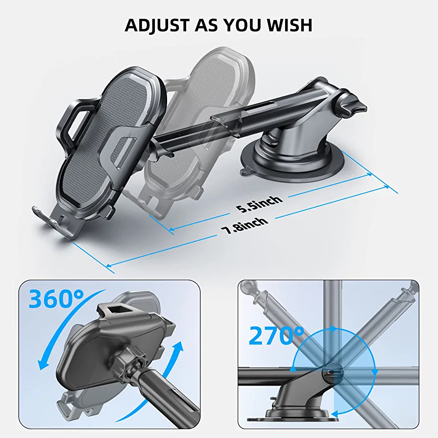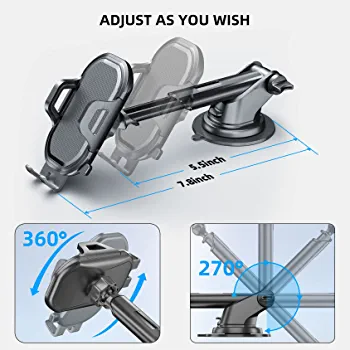 Perfect Flexibility: Car phone holder with 360°ball joint and adjustable telescopic arm, which can adjust your phone to any ideal angle without obstructing your view. The telescopic arm can be extended from 5 inches to 7 inches. Easily adjust the distance between you and the car mount