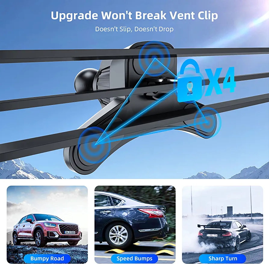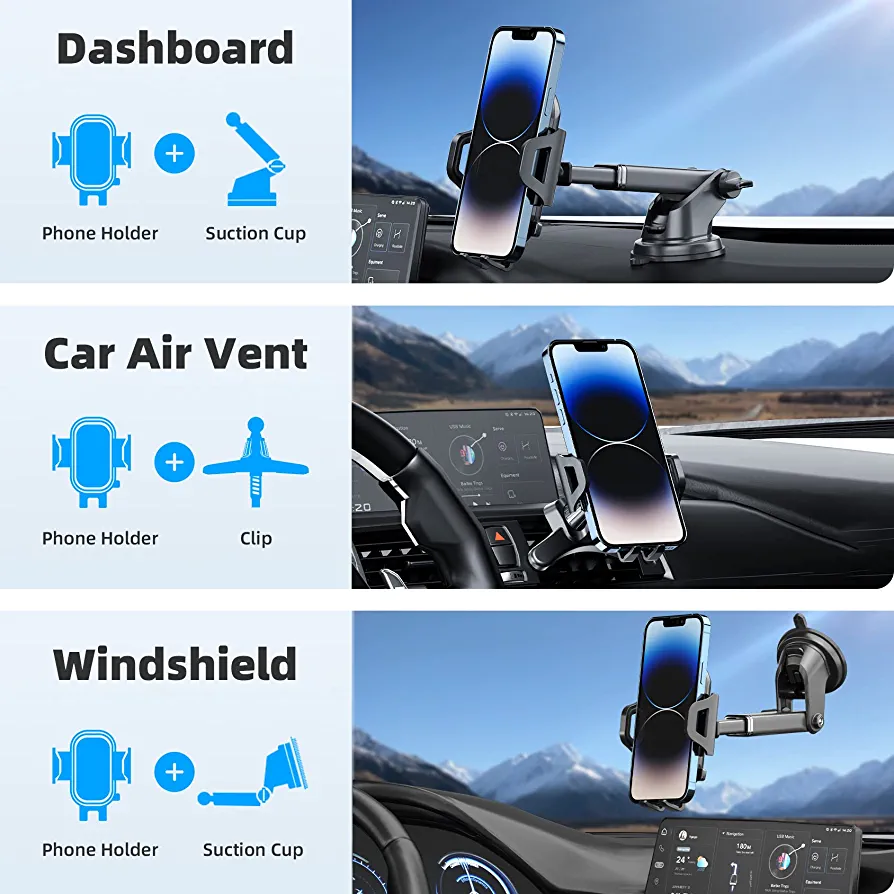 3 IN 1 Car Phone Holder: Felaladress phone mount for car is equipped with suction cup and vent clip, which can be freely mounted on the windshield, dashboard, and vent to supply your different usage needs. The cell phone holder is applied to most cars, vans, SUVs, cabs. A perfect assistant for Uber, Lyft drivers