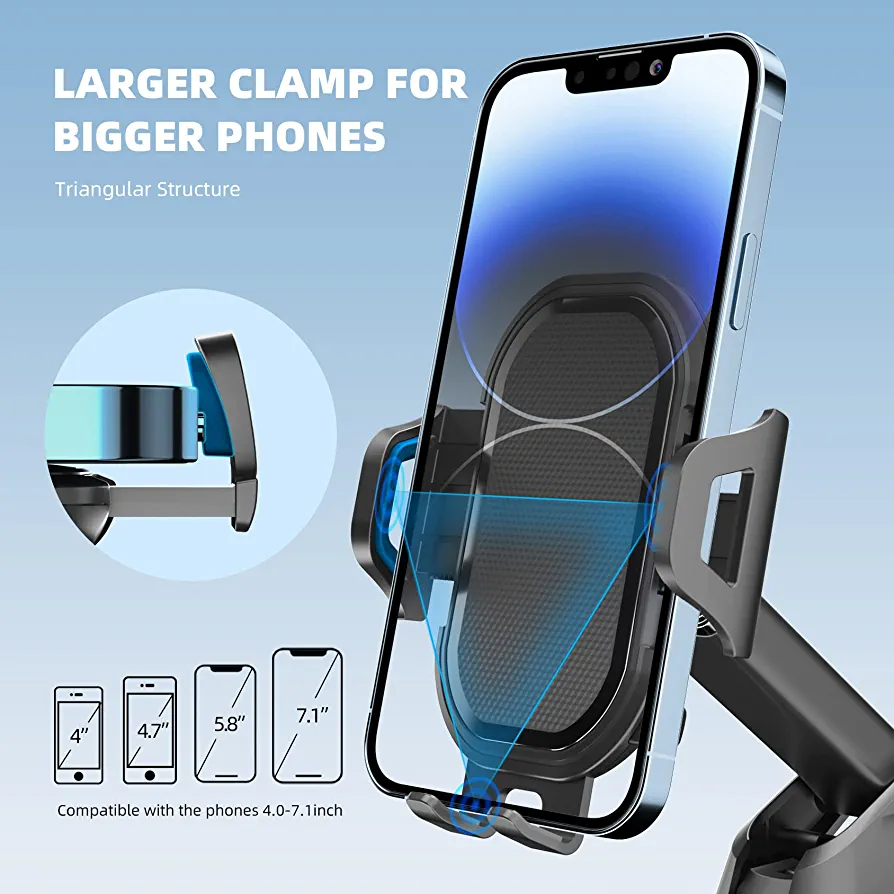Easy Operation: The phone mount for car has a one-touch release button, you can release your phone with one hand while driving. Adjustable feet fit all phones from 4.0 to 7.0 inches and most thick cases