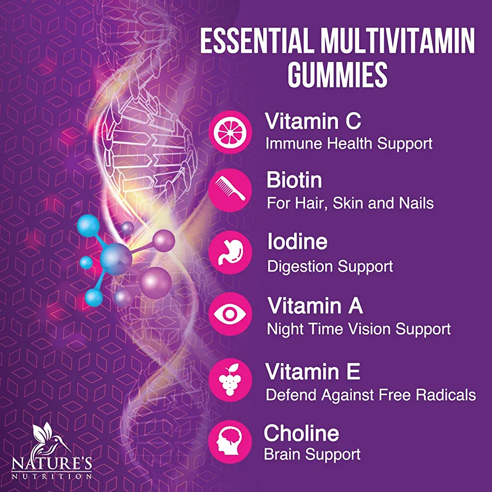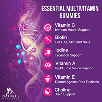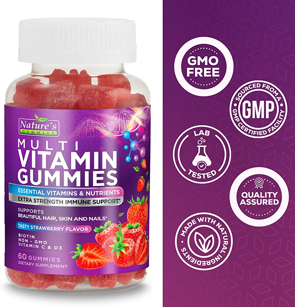 Introducing Nature’s Gummies Multivitamin Gummies, a natural and complete daily gummy vitamin supplement designed to provide extra strength immune support with vitamins D, C, and biotin. Our chewable multivitamins are formulated with biotin to support hair, skin, and nails, making it an ideal choice for both men and women.