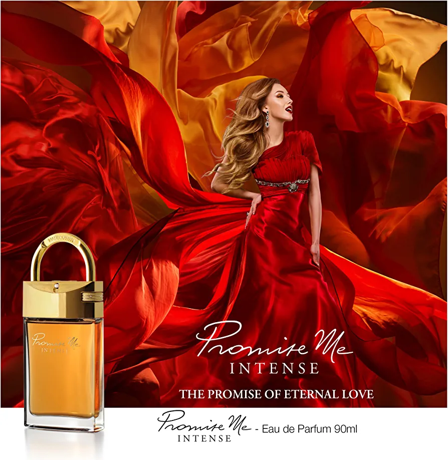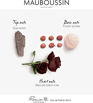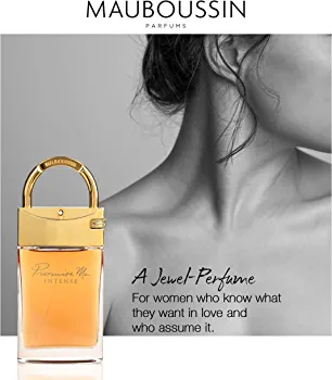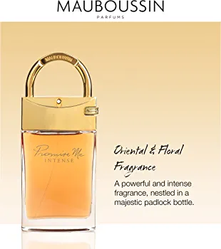 | descriptionOriginal | Promise Me Intense The promise of an intense love! Mauboussin Promise Me Intense is an eau de parfum full of personality and enchanting. Nestled in an elegant padlock bottle, its oriental and floral olfactory notes give way to an intense wake of captivating scents. An intense fragrance A bold perfume created for today's women: sensual, seductive and determined. A jewel bottle Power and Majesty are dedicated to this padlock bottle signed by the elegance of the Mauboussin ring "The First Day". A charming scent An eau de parfum full of personality and enchanting, for which a saffron rose duo is mixed with a patchouli-oud accord. A promise of power, wake and intensity… Oriental and Floral Scents Head note: Frozen Lychee Promise Me Promise Me Intense Promise Me FLower |
