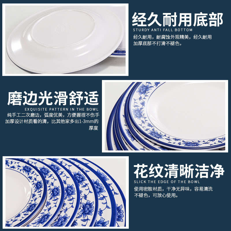 | nameOriginal | Wholesale melamine tableware imitation porcelain plate blue and white porcelain flat plate shallow plate vegetable plate plastic plate round bone plate commercial |