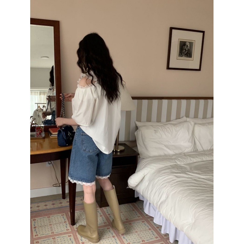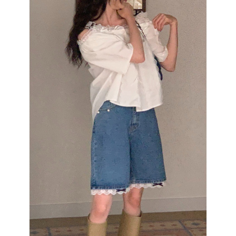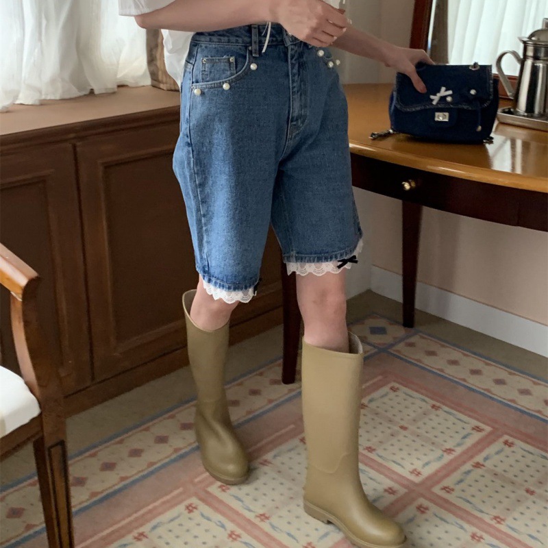 2024 Summer New Arrival South Korea Chic High Waist All-Match Stitching Lace-Trimmed Bow Denim Pants