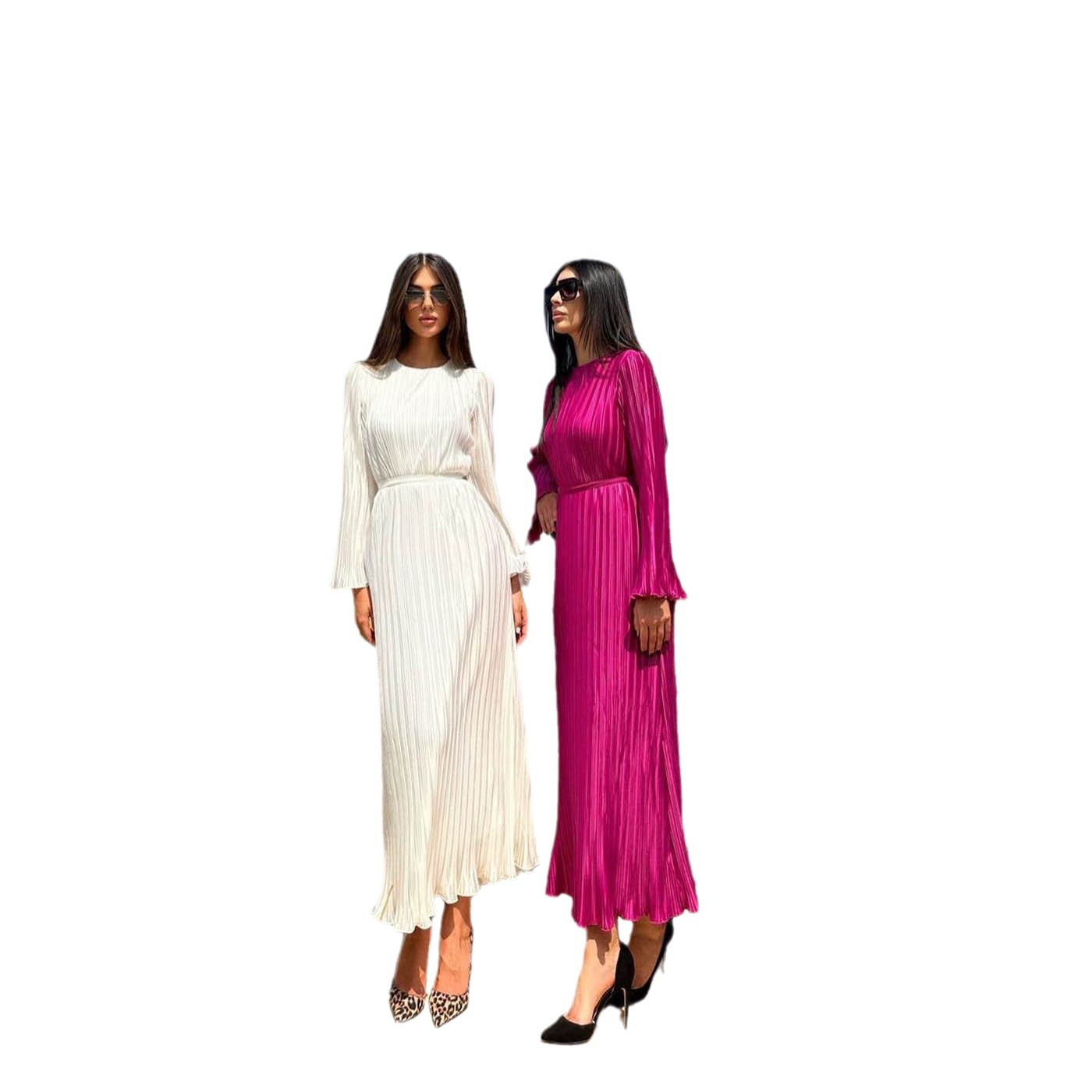 | nameOriginal | European and American Women's 2024 Spring and Autumn New Fashion Long Dress Women's Casual Solid Color Round Neck Trumpet Sleeve Pleated Dress |