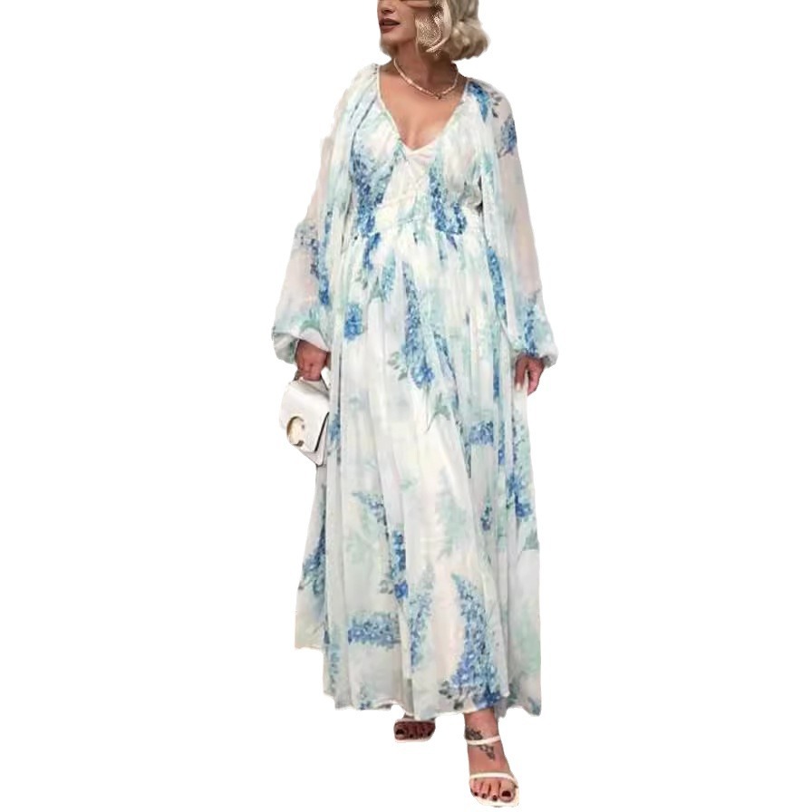 | nameOriginal | Independent Station Foreign Trade European and American Women's Clothing Printed Chiffon dress V-Neck Perspective Pleated Waist Drawstring Long Sleeve 8042 |