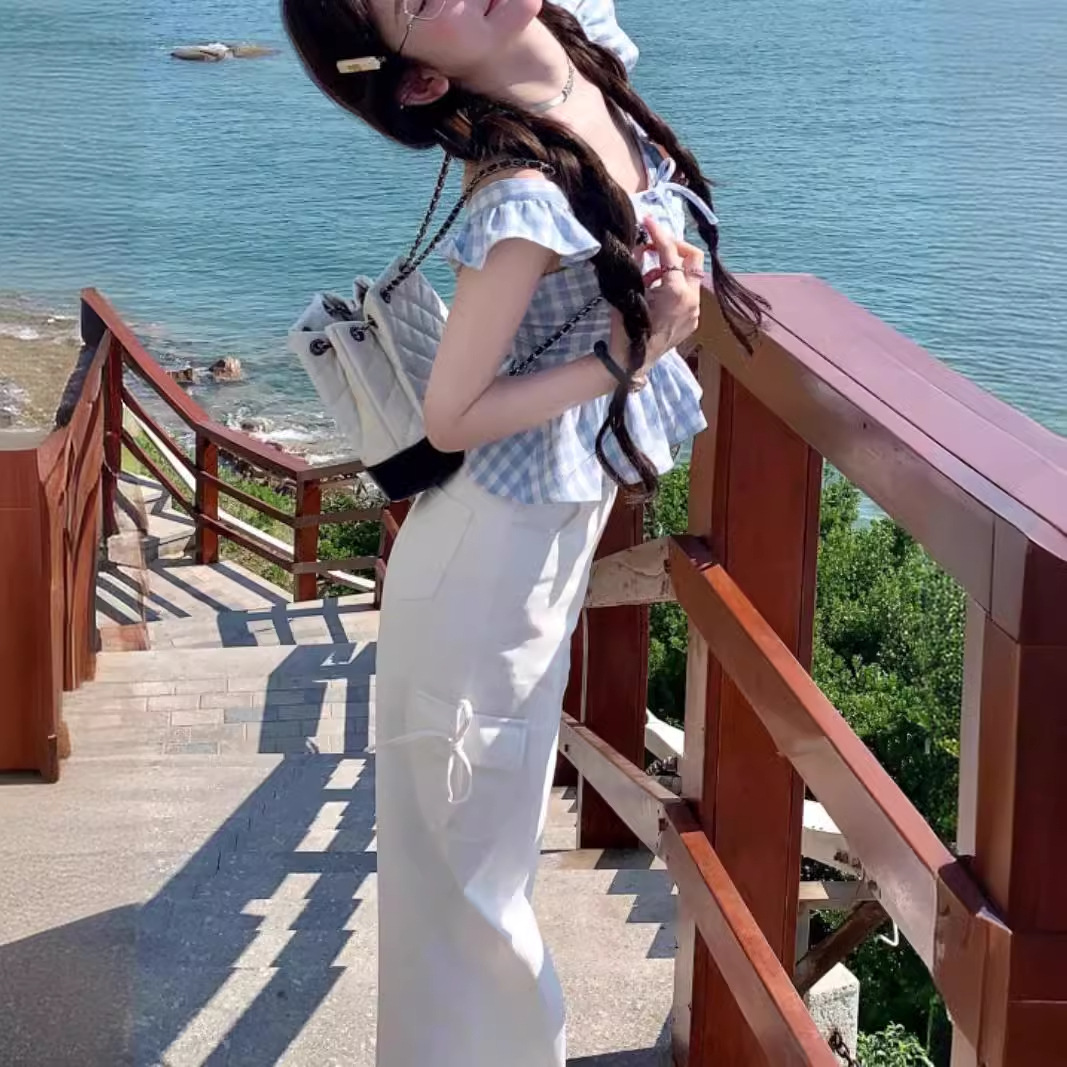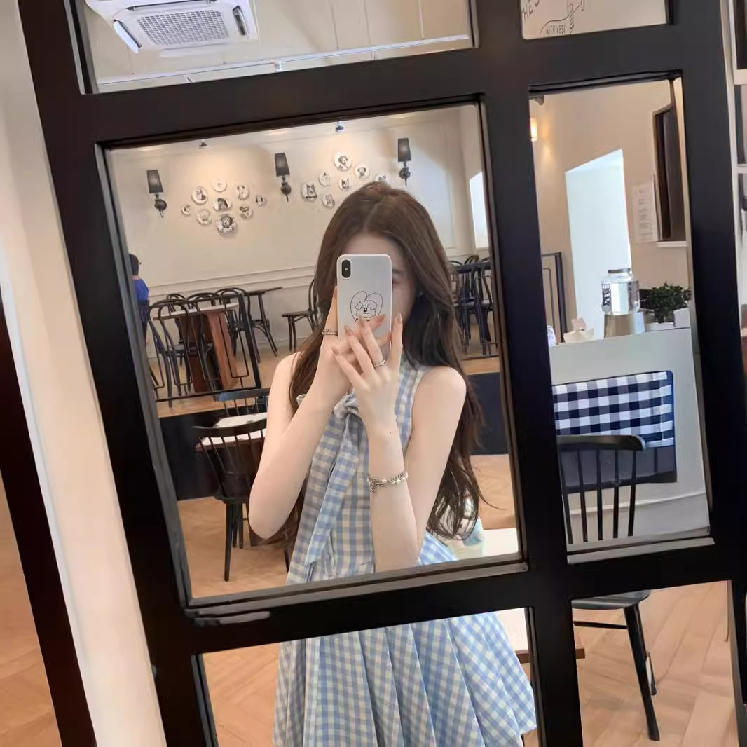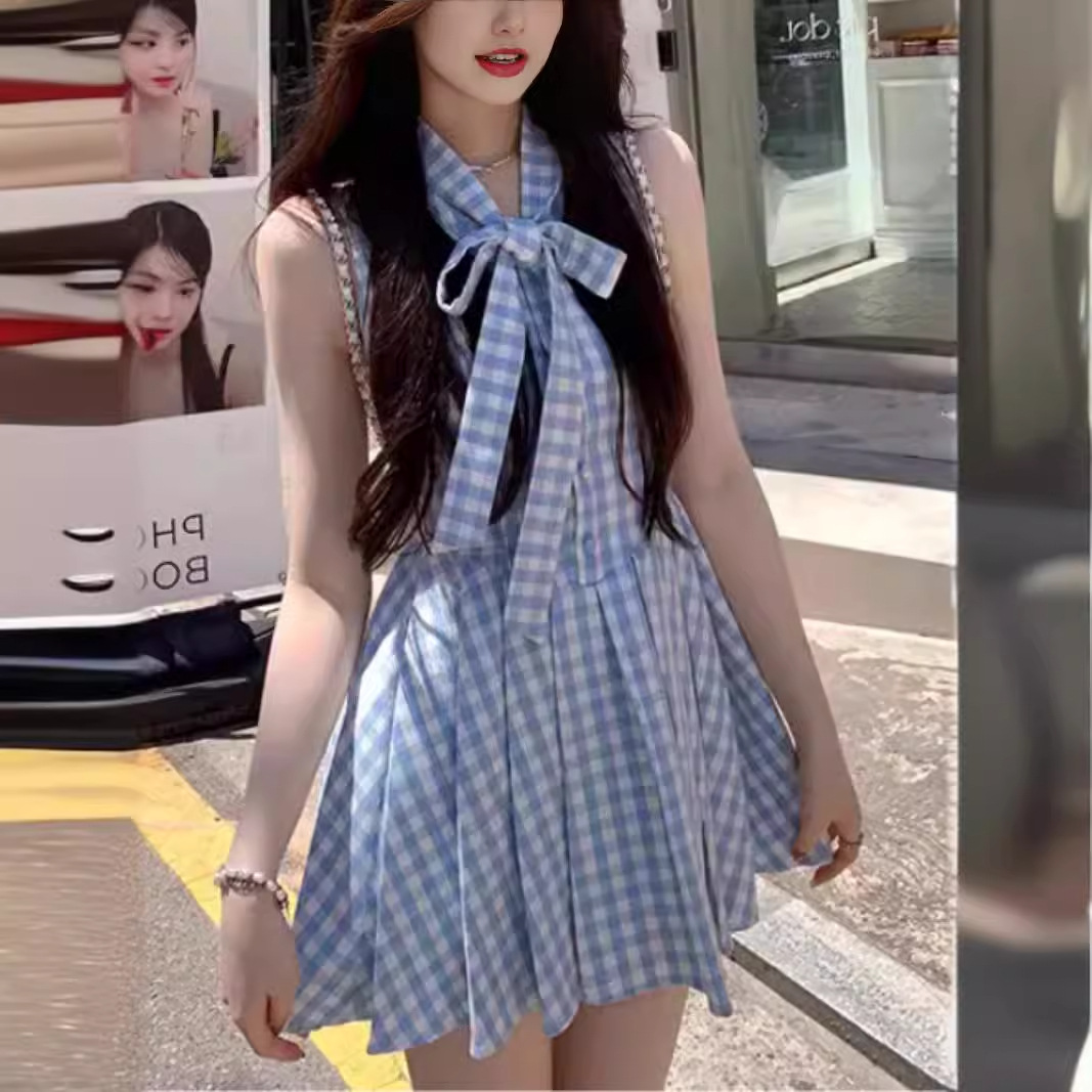 | nameOriginal | Summer White Blue and White Plaid Flying Sleeve Top/Bow dress |