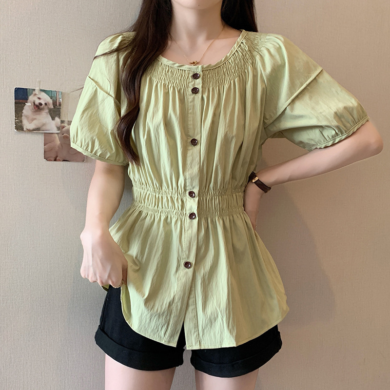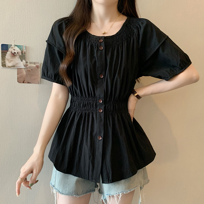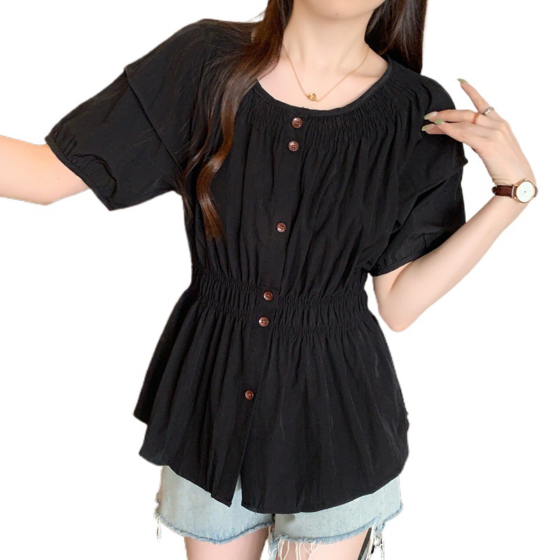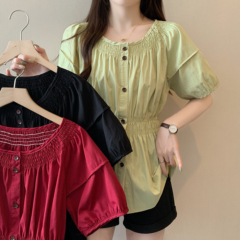 | nameOriginal | Real shot 2024 summer new chubby girl plus size women's French round neck design pleated waist chic shirt |