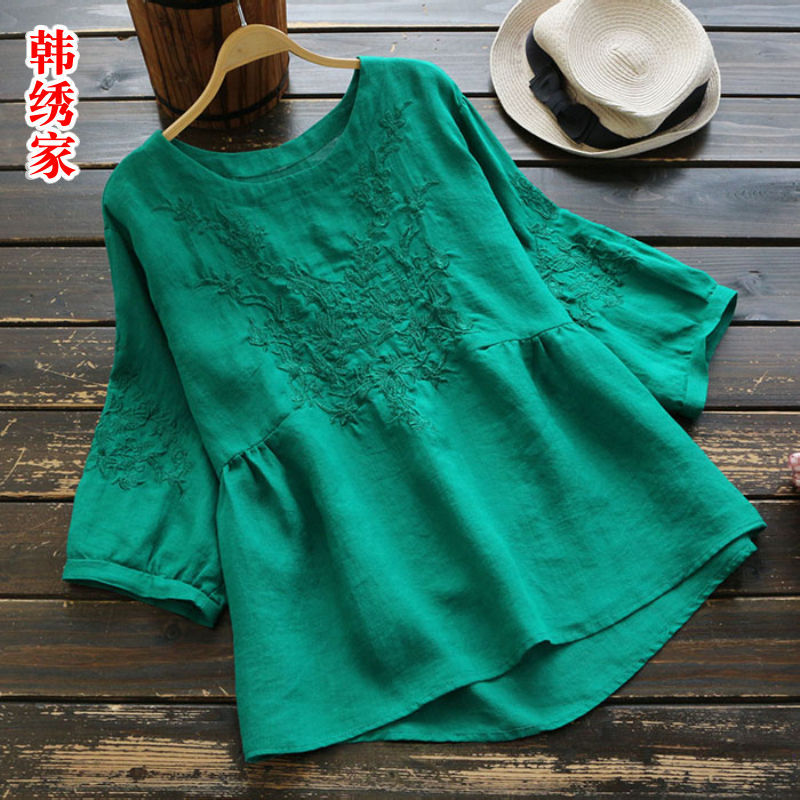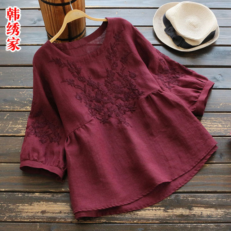 | nameOriginal | [95 Cotton] Retro Ethnic Embroidered Round Neck T-Shirt 2023 New Large Size Women's Loose Artistic Top |