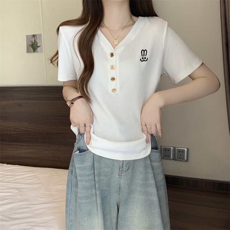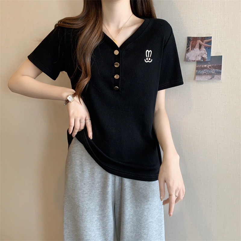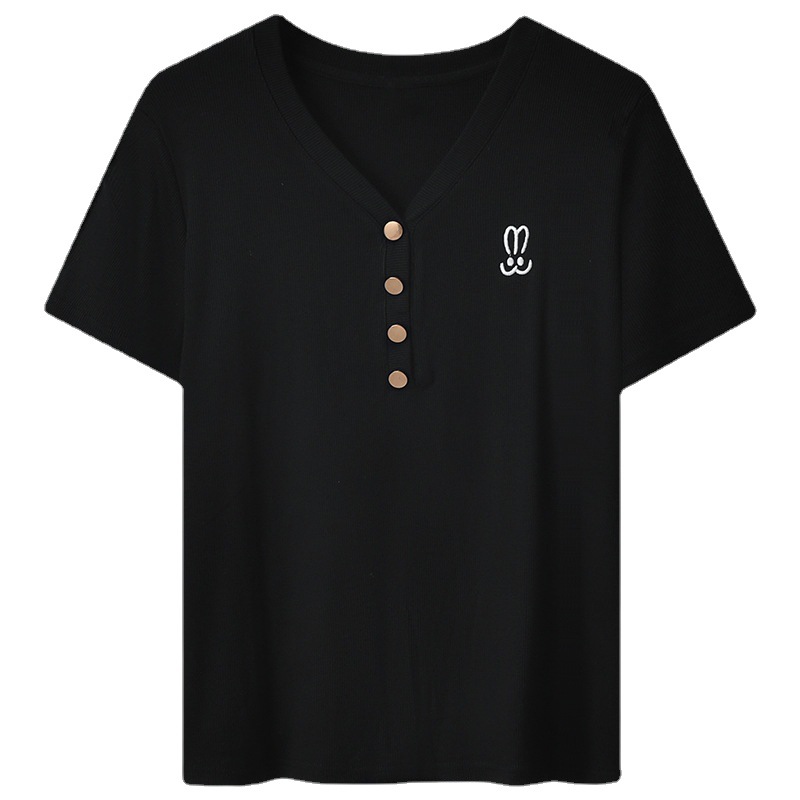 | nameOriginal | plus size Rabbit Embroidered V-neck Short-sleeved T-shirt Women's Summer chubby girl Belly Covering Slimming Design Sense Shoulder Knitted Top |