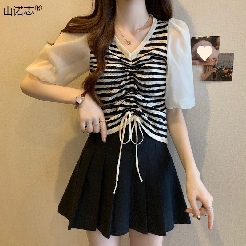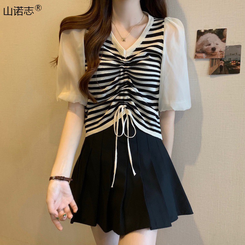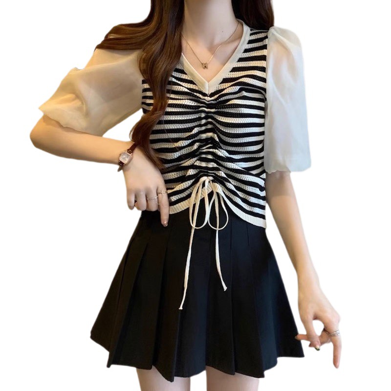 | nameOriginal | Bubble Sleeve V-neck Striped Short-sleeved T-shirt Women's Summer plus size chubby girl Beautiful Small Shirt Slimming Irregular Drawstring Top Hair |