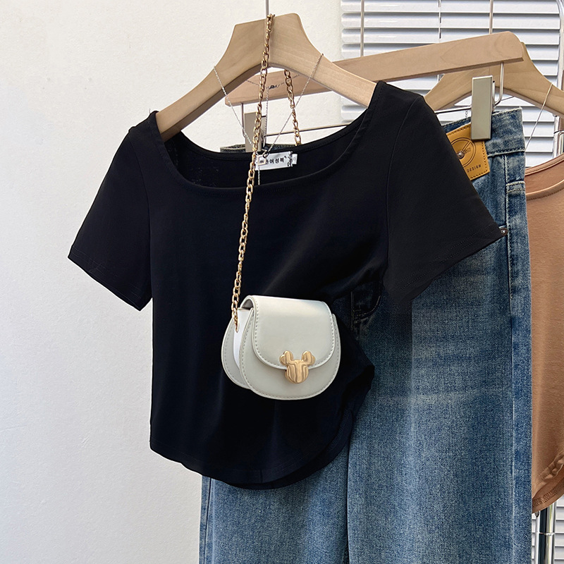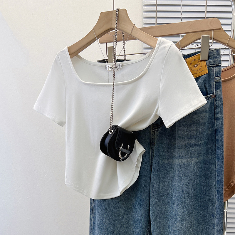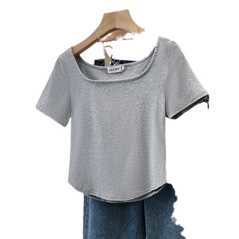 | nameOriginal | Real Shot Square Collar Short-sleeved T-shirt Women's Summer Shoulder Short Tight Solid Color Base Shirt Korean Simple Half-sleeved T-shirt |