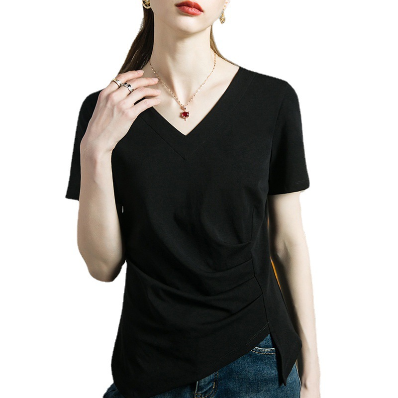 | nameOriginal | 2023 solid color V-neck T-shirt women's 1688 short-sleeved slim-fit irregular pleated top Western style cotton T-shirt |
