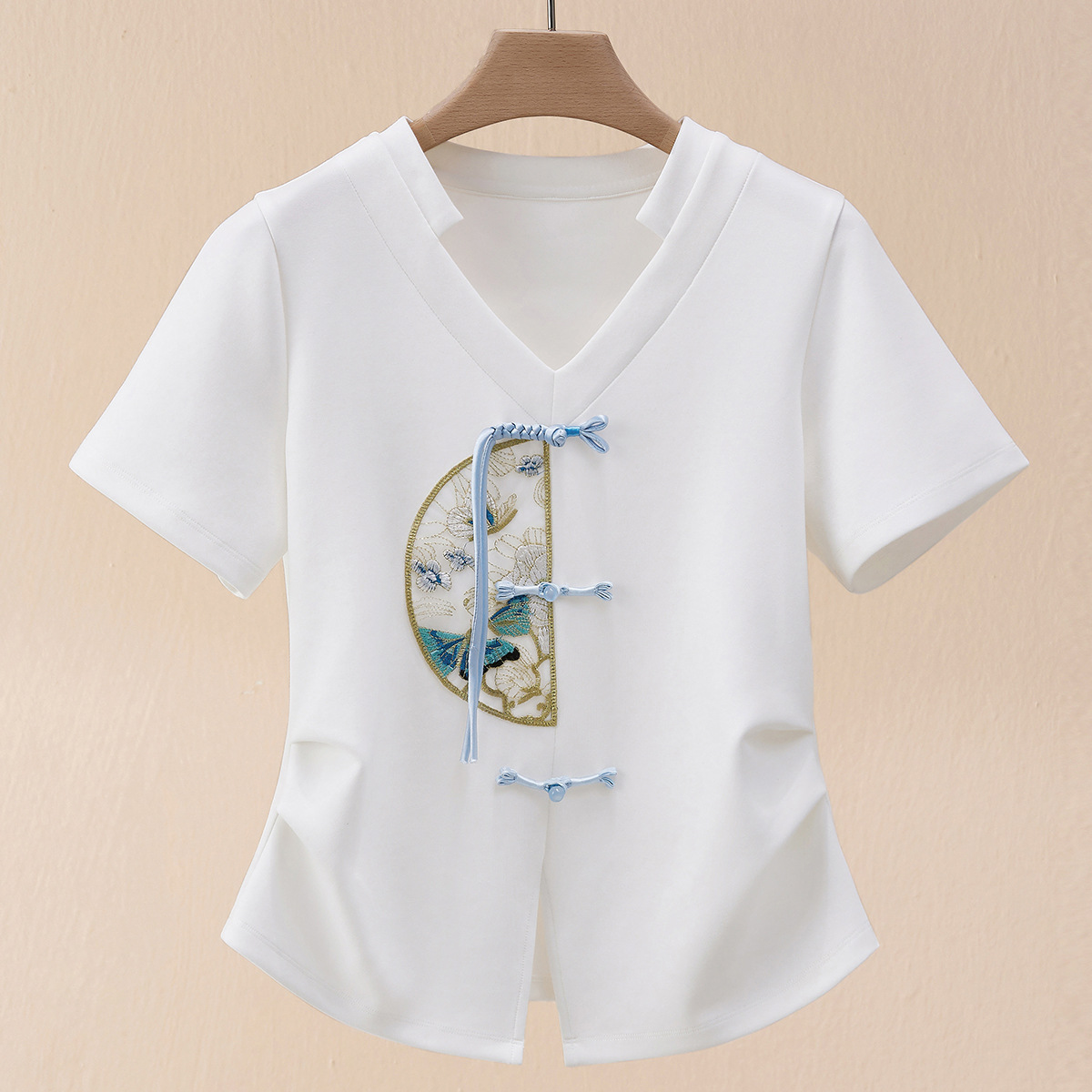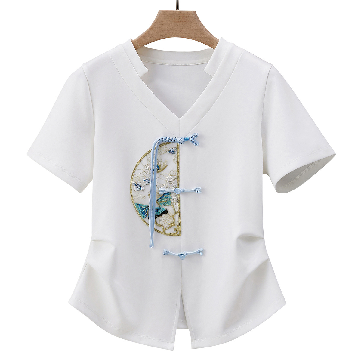 | nameOriginal | Guofeng Buckle Top Women's Summer 2024 New Retro New Chinese Unique Chic White T-shirt Women's V-neck Short Sleeve |