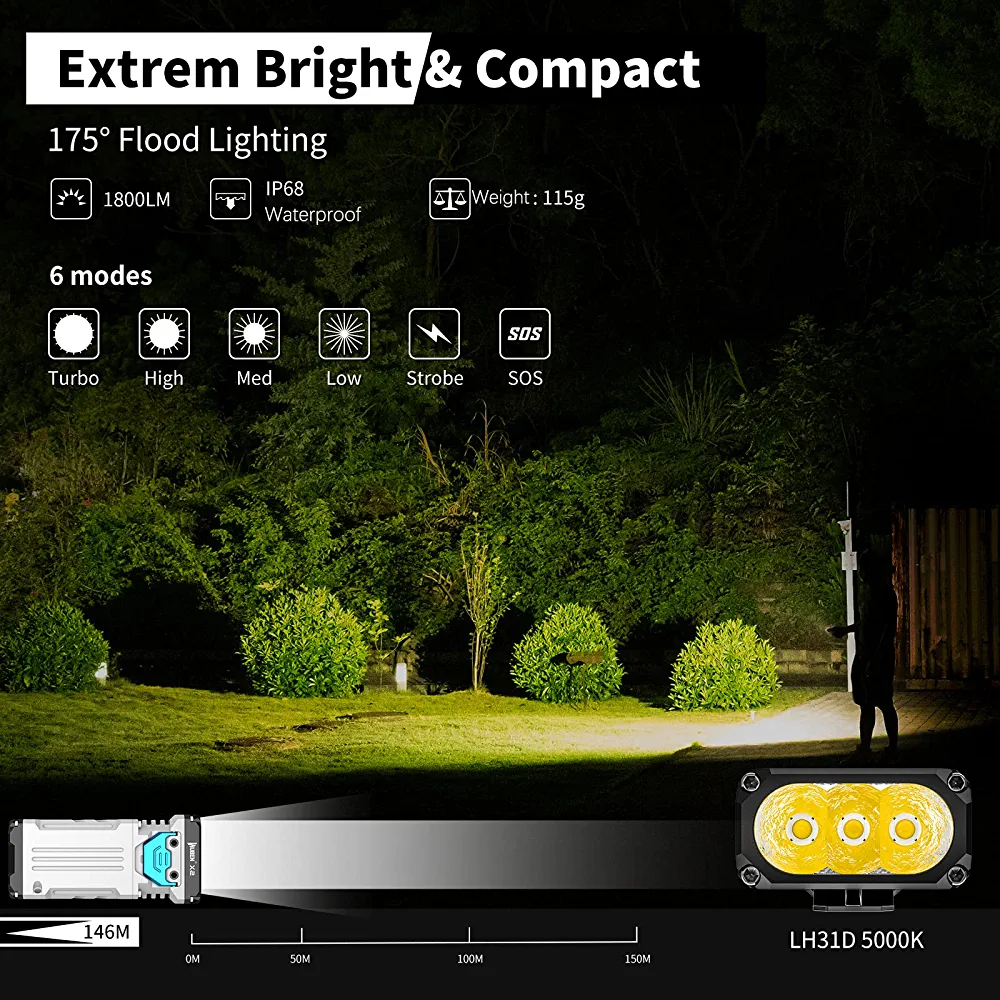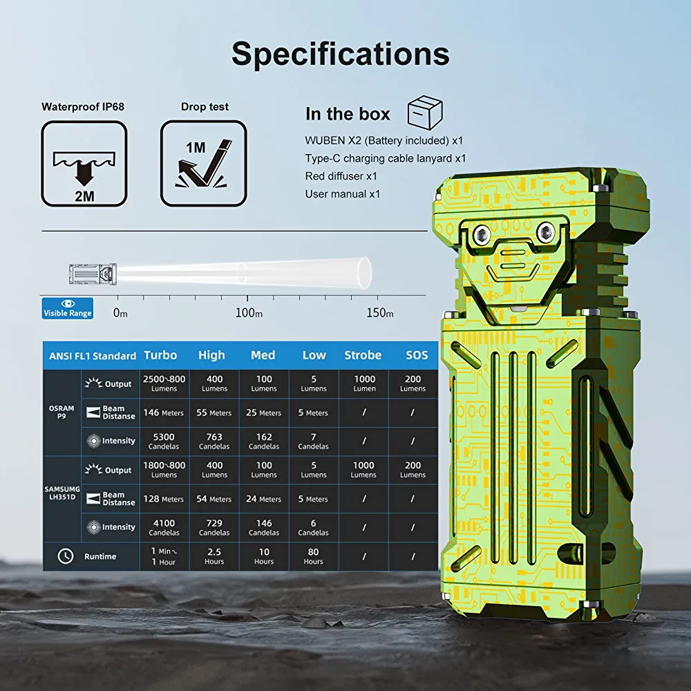 [INNOVATIVE DESIGN] WUBEN X2 is a professional outdoor pocket flashlight with an innovative and trendy appearance. Can be your smallest yet the brightest easy-carry light Equipped with 3pcs of LH351D 90CRI high color rendering 5000K LED, 175°wide-angle floodlighting, instant burst 2,500 high lumens turning night into day, and the surroundings of the target are clearly visible.