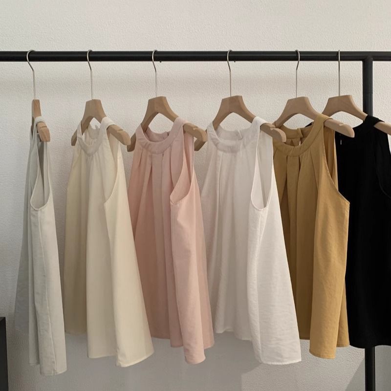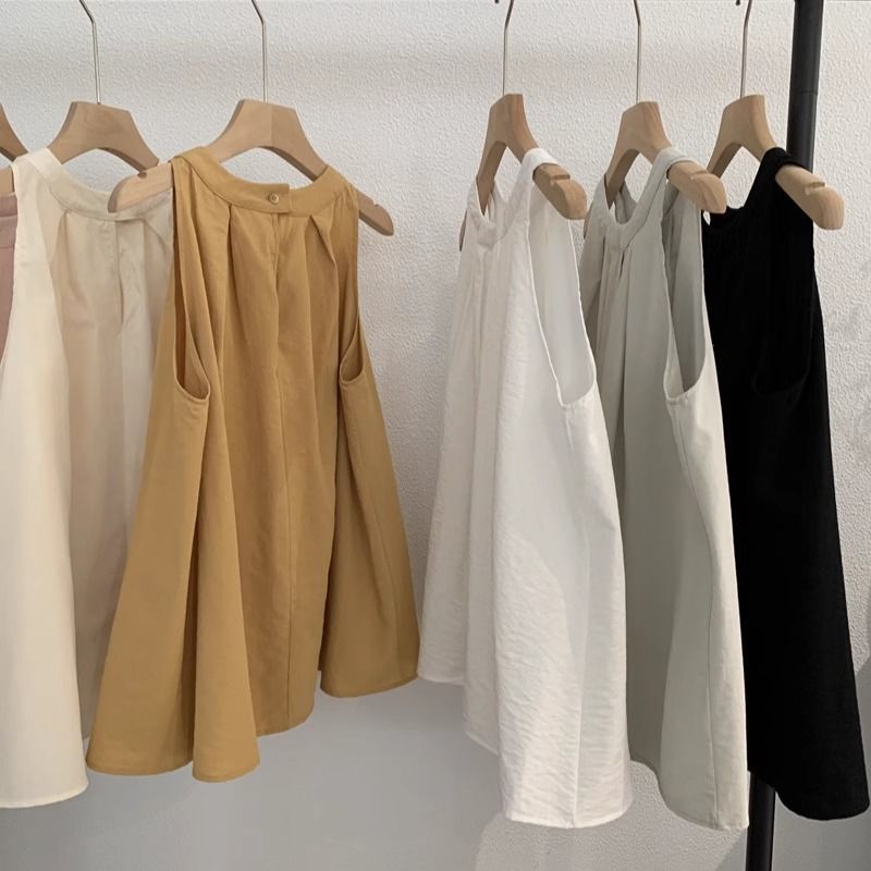 | nameOriginal | Round neck sleeveless vest top chest pleated solid color retro sweet doll shirt women's 2024 summer temperament |