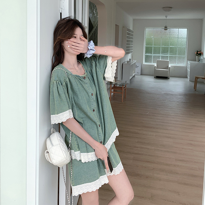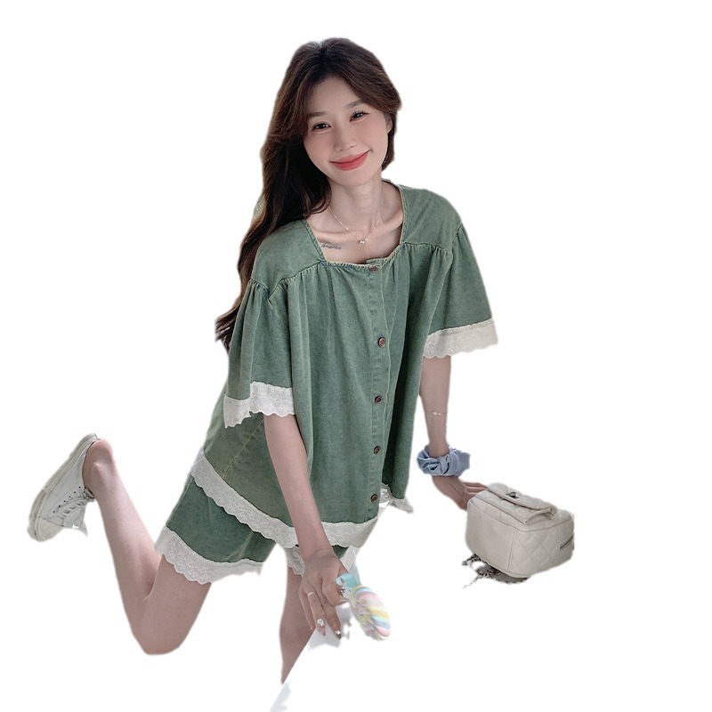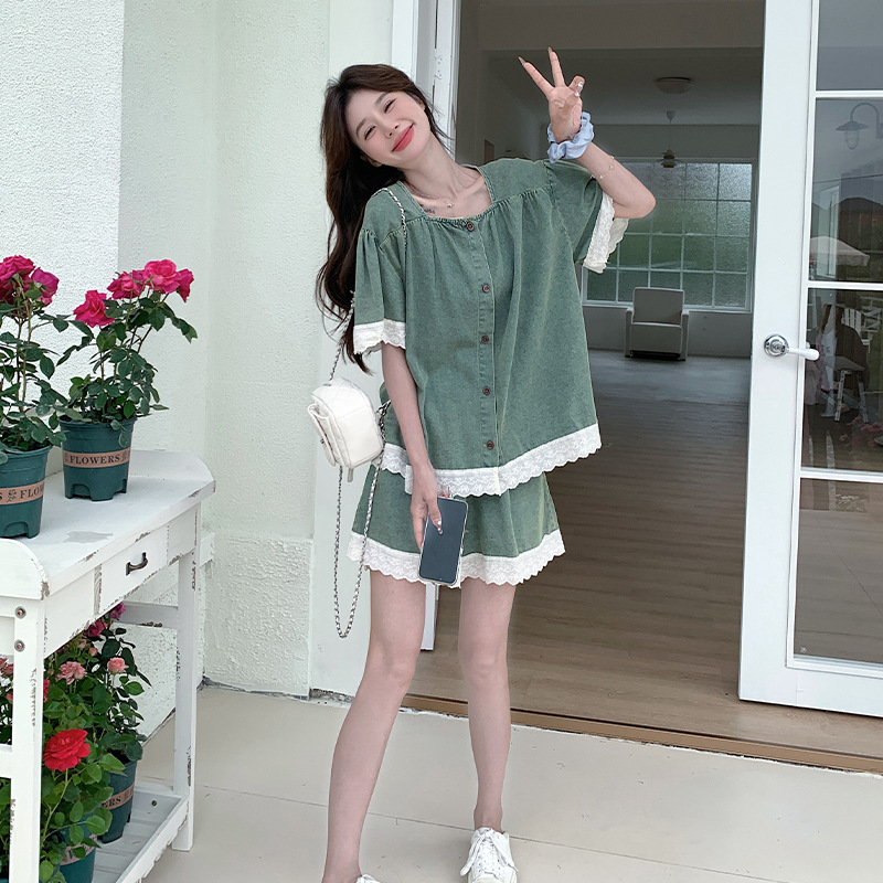 | nameOriginal | Lace Stitching Denim Shorts suit Summer 2024 New Short-sleeved Top Fashion Two-piece Light Luxury Women |
