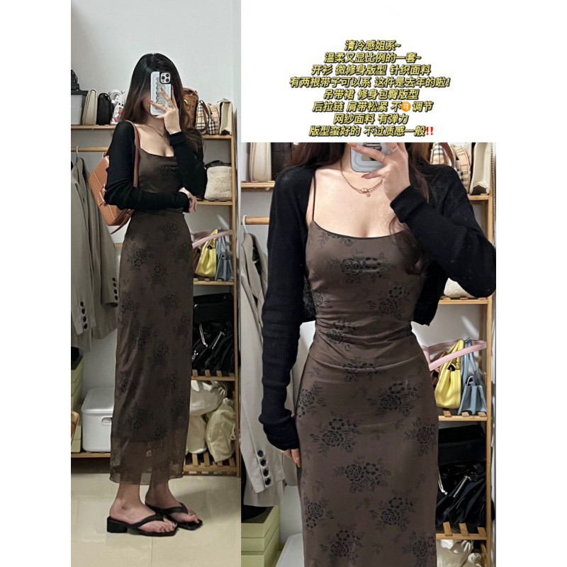 | nameOriginal | Summer Salt Wear with Fried Street Design Sense Royal Sister Fan Light Mature Wind Spice Sling dress Cardigan Two-piece Suit |