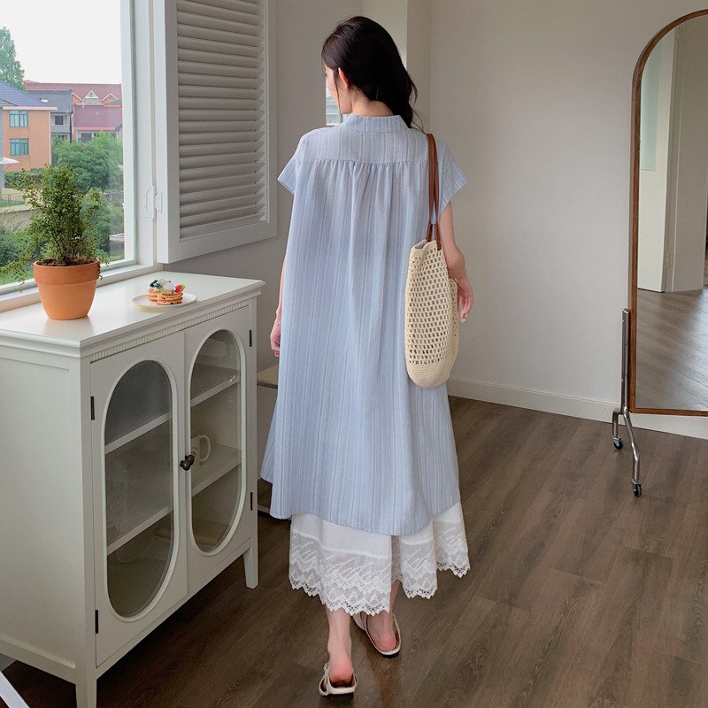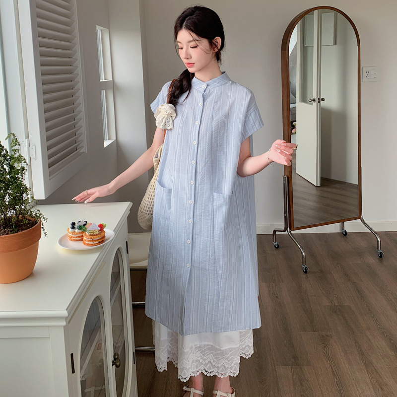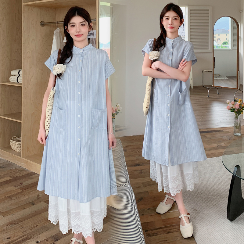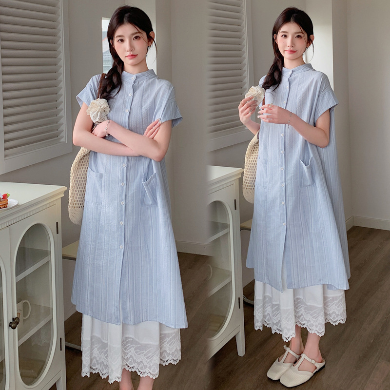 | nameOriginal | Summer New Pregnant Women Blue Striped Shirt Dress + Pig Nose Buckle Adjustable Lace Skirt |