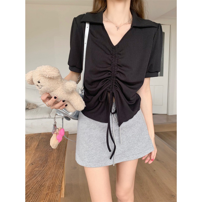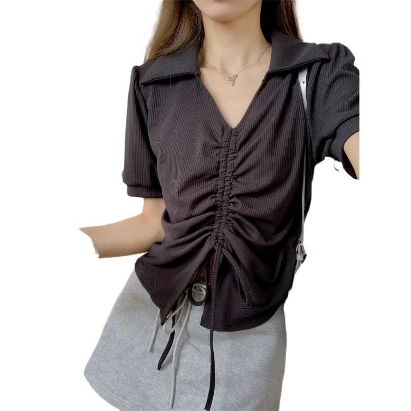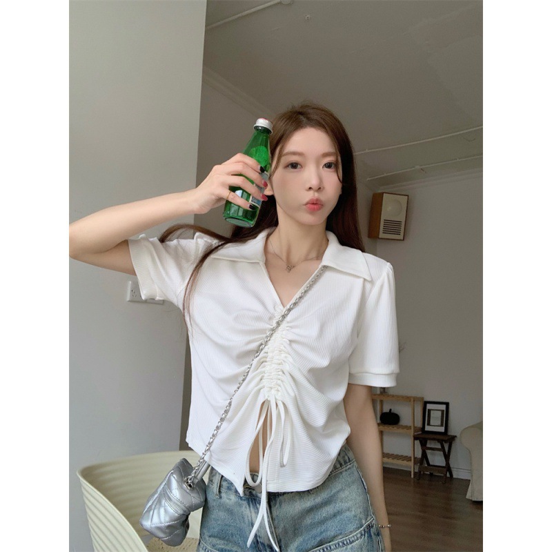 | nameOriginal | plus size Drawstring Polo Collar Short-sleeved T-shirt Women's 2024 Summer Sweet and Hot Loose Slimming Belly Covering Age-reducing Short Top |