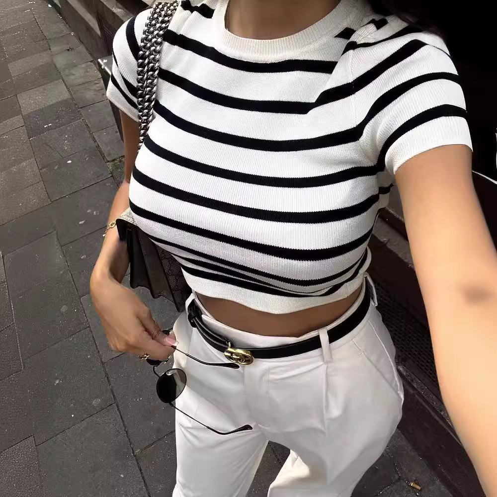 | nameOriginal | 2023 Spring New Women's Clothing European and American Contrast Color Stripe Short Sleeve Threaded Knitted Shirt Short T-Shirt Top Women 8LS2378 |