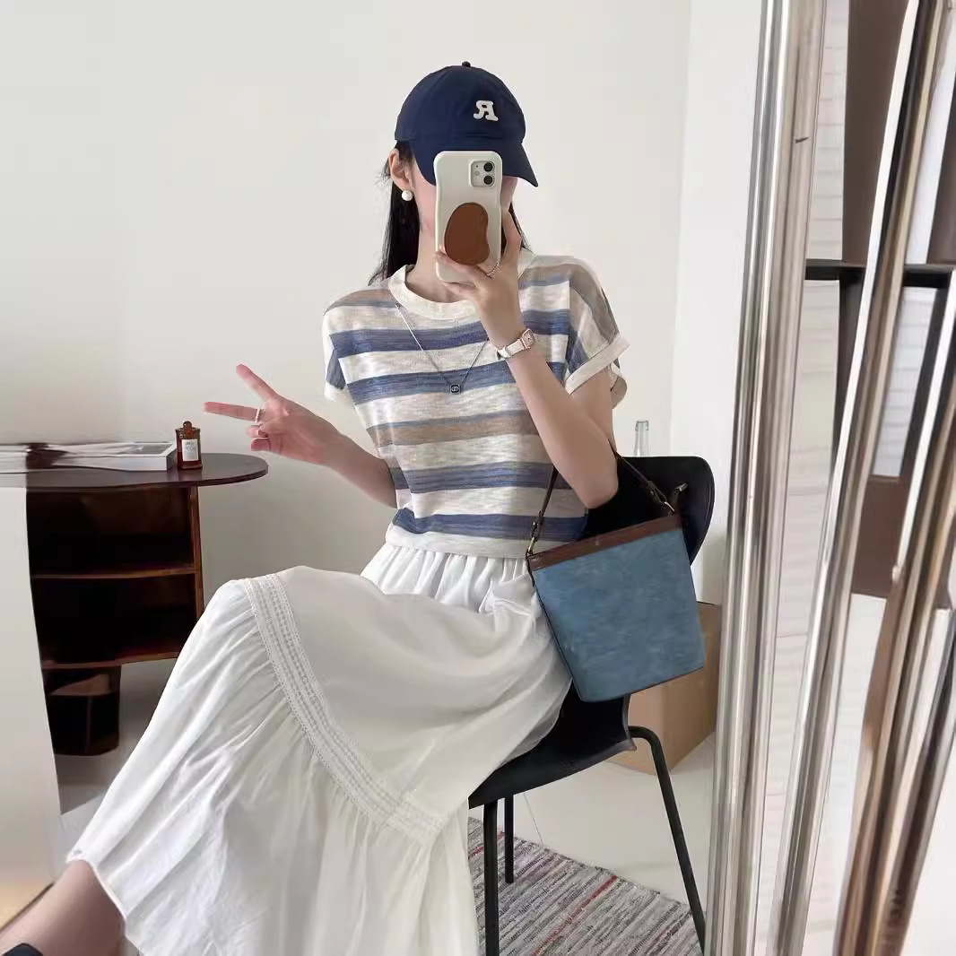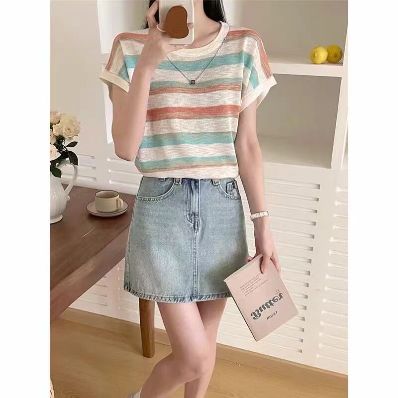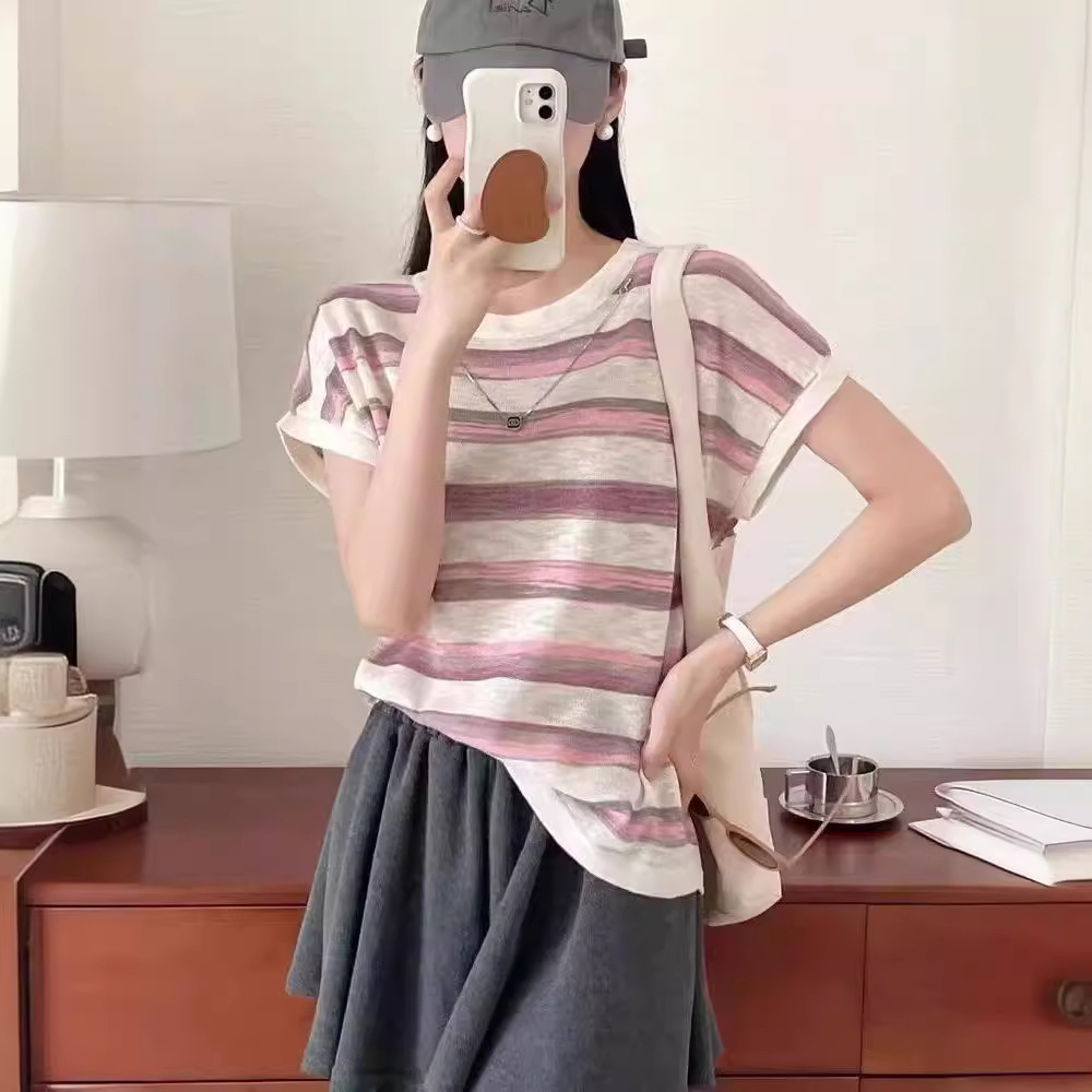 Knitted Striped T-Shirt Women’s Short-sleeved 2024 New Arrival Explosive Summer Short Top Fashionable Stylish