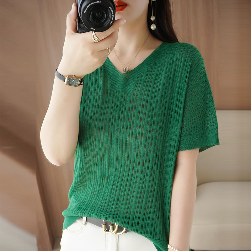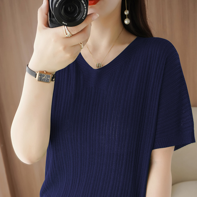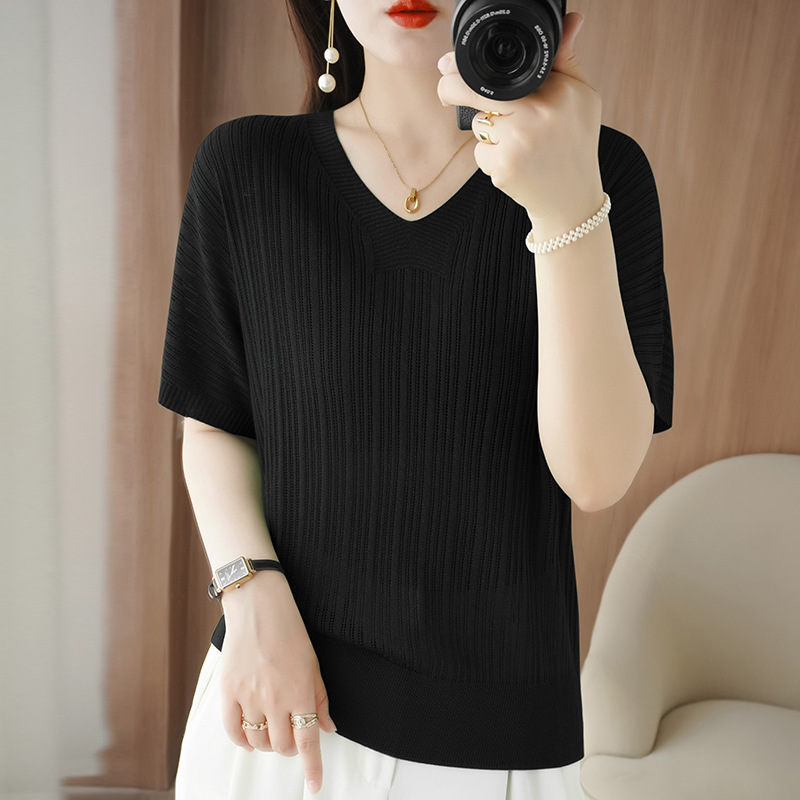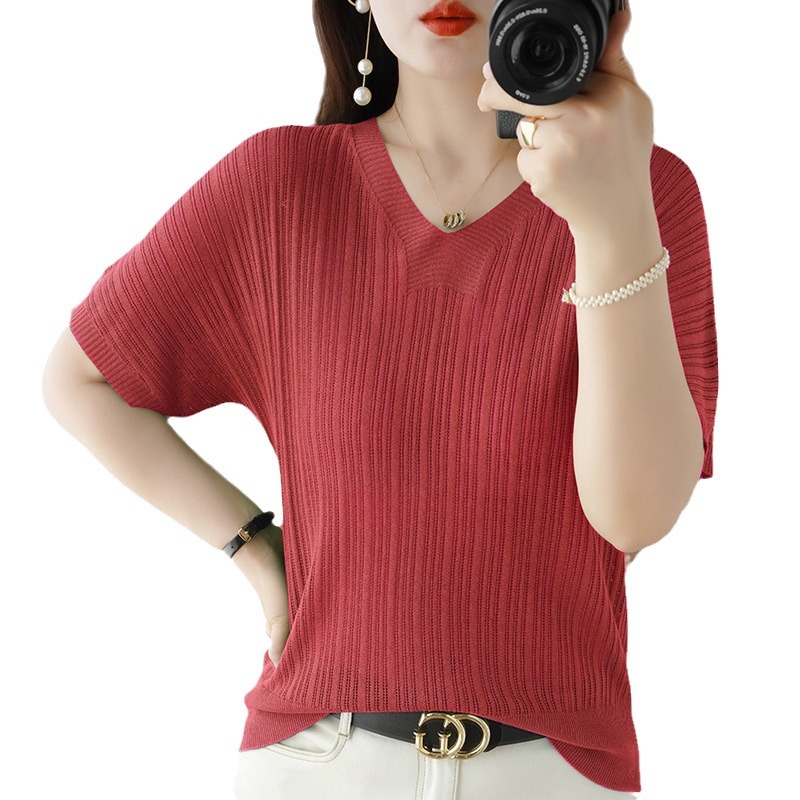 | nameOriginal | 2024 Summer New Knitted Short-sleeved T-shirt Women's Loose Pit V-neck Versatile Half-sleeved Thin Top |