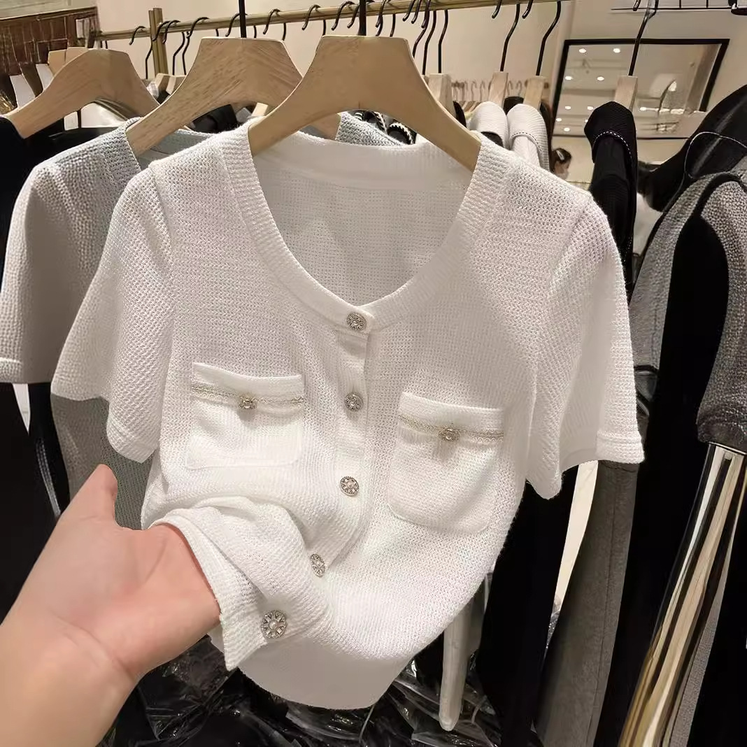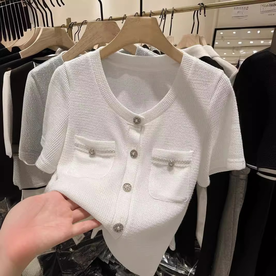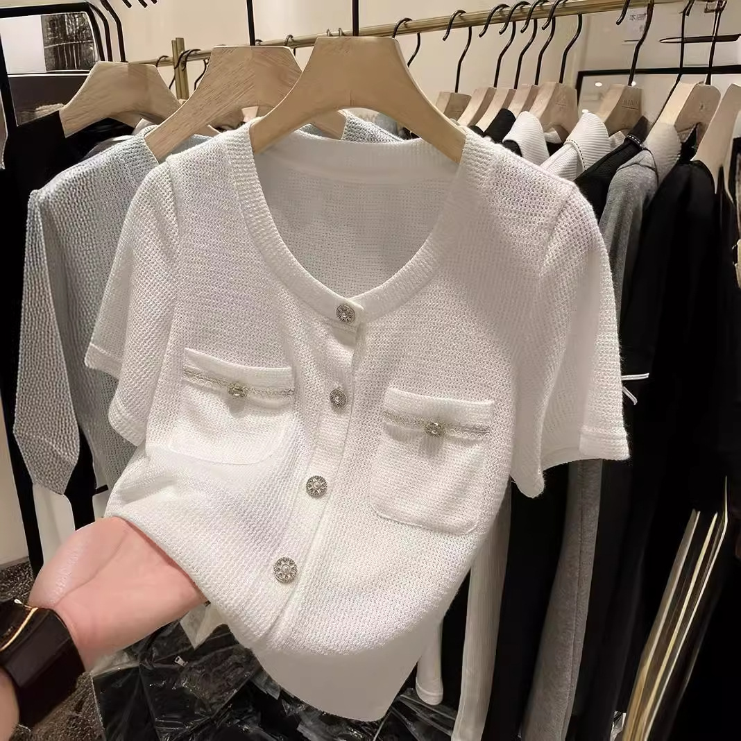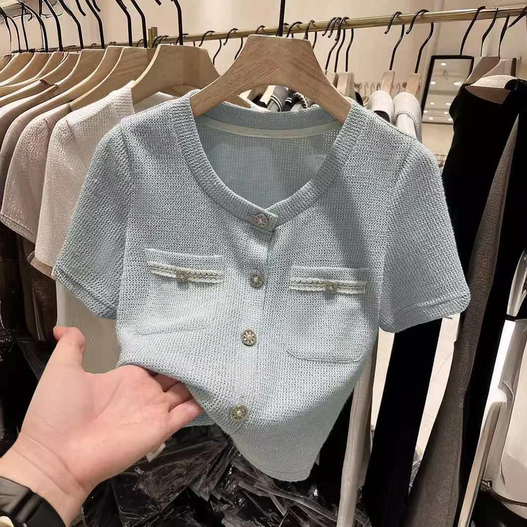 | nameOriginal | Soft Milk Blue Chanel Style Short-sleeved Top Women's Summer Thin Knitted Cardigan French High-end Crewneck Cardigan Jacket |