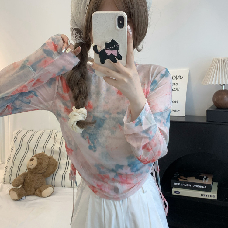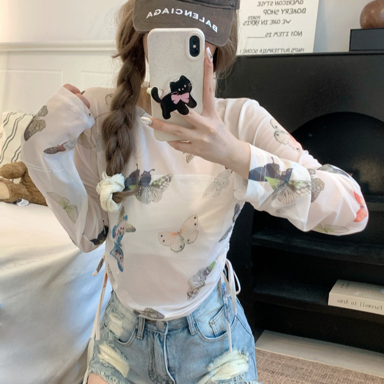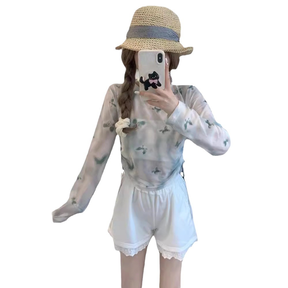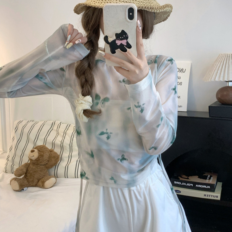 | nameOriginal | Pure Desire Style Floral Ruffle Long-sleeved T-shirt Women's 2024 Summer New Retro Round Neck Chic Sun Screen Mesh Top |