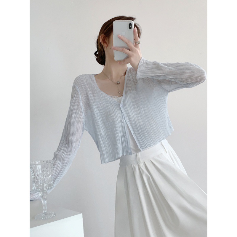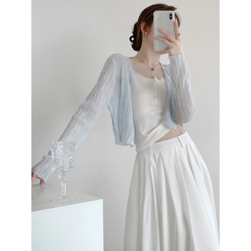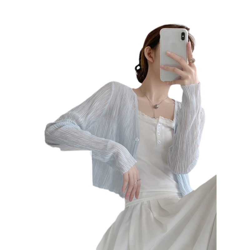 | nameOriginal | Ice Silk Sunscreen Cardigan Women's Thin Skirt with Suspender 2024 Summer Outer Long Sleeve V-neck Blouse Short Top |