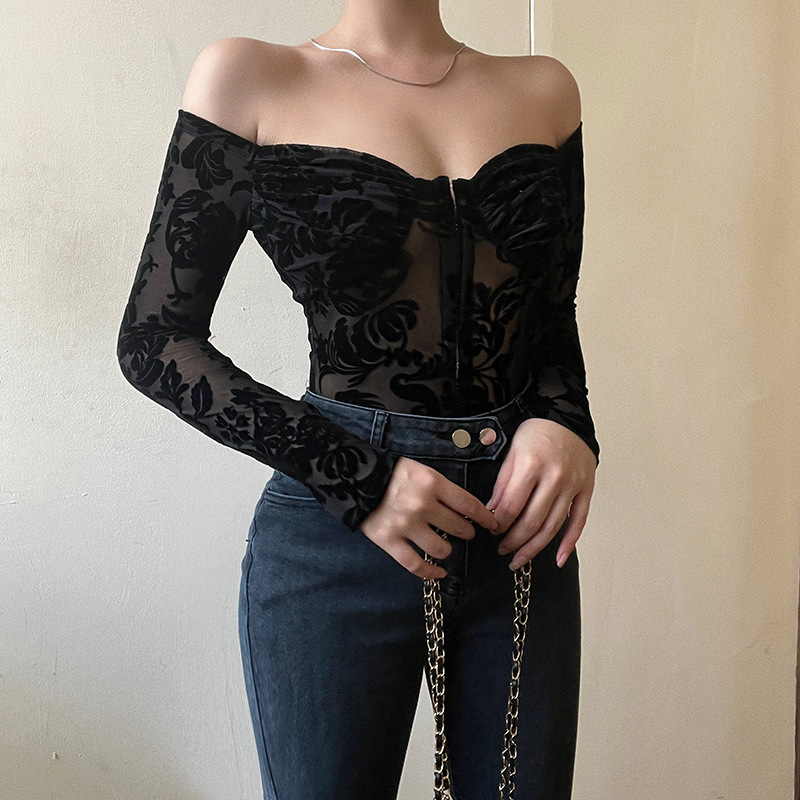 | nameOriginal | JY23638 Autumn New lace printed slim-fit jumpsuit European and American style flocking off-shoulder long-sleeved top for women |