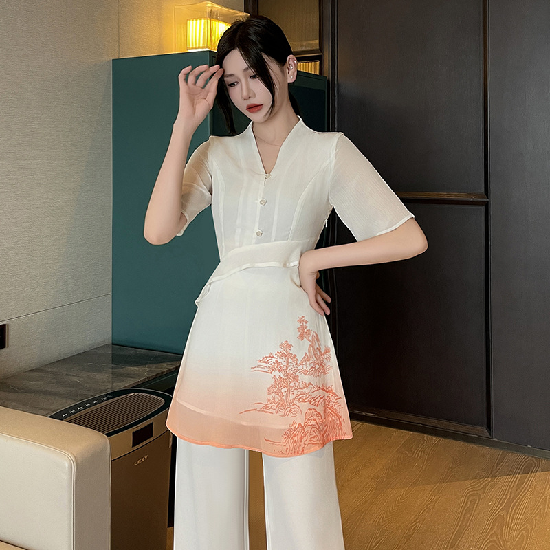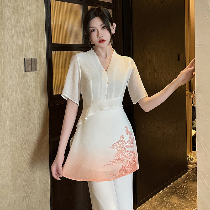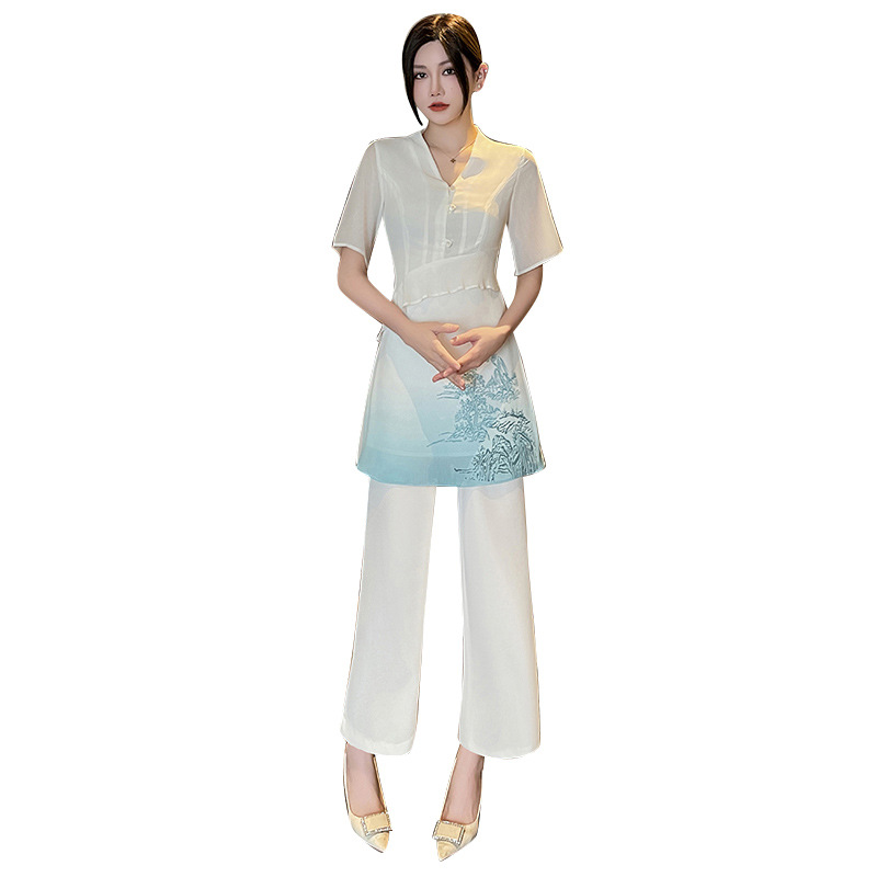 | nameOriginal | New chiffon foot bath shop pedicure technician work clothes fairy Chinese High Sense spa beautician suit |