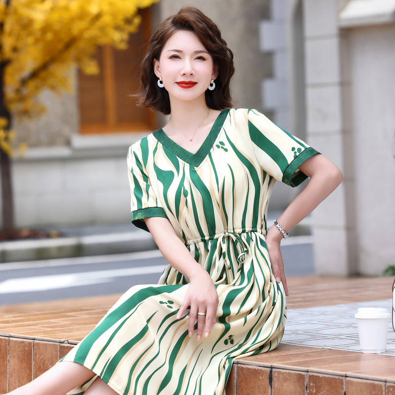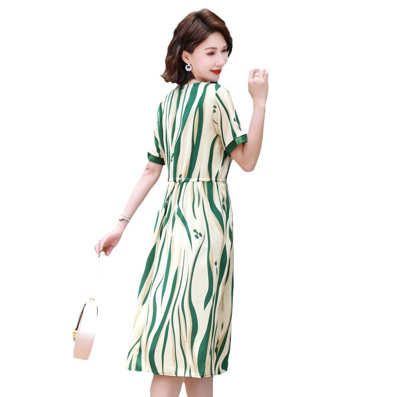 | nameOriginal | Striped chiffon dress 2024 summer new women's fashion waist slimming goddess fan covered meat mother skirt |