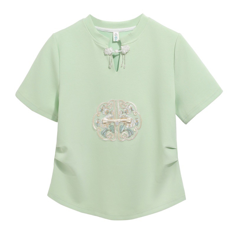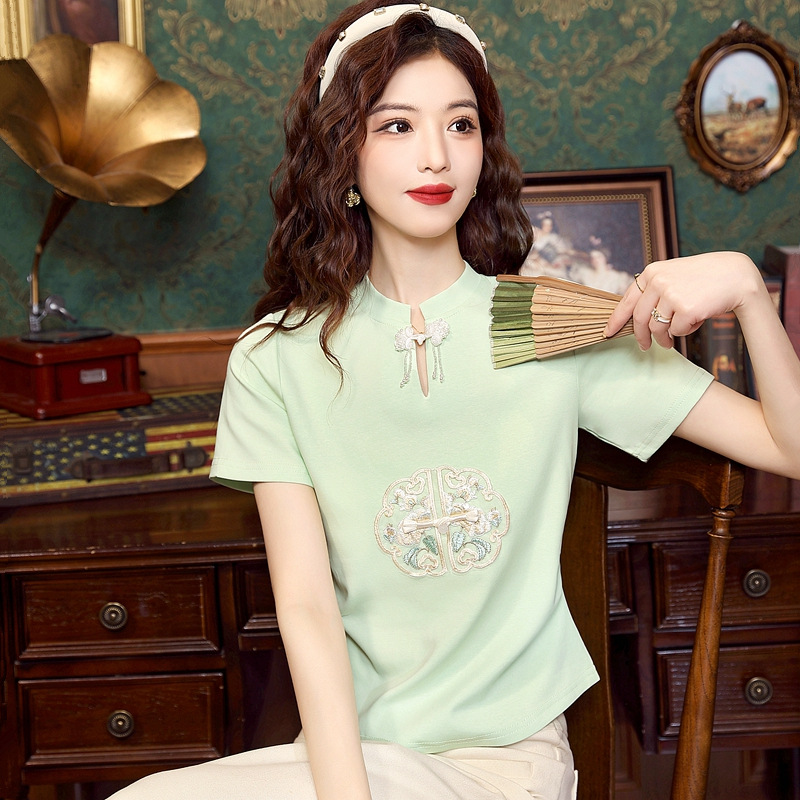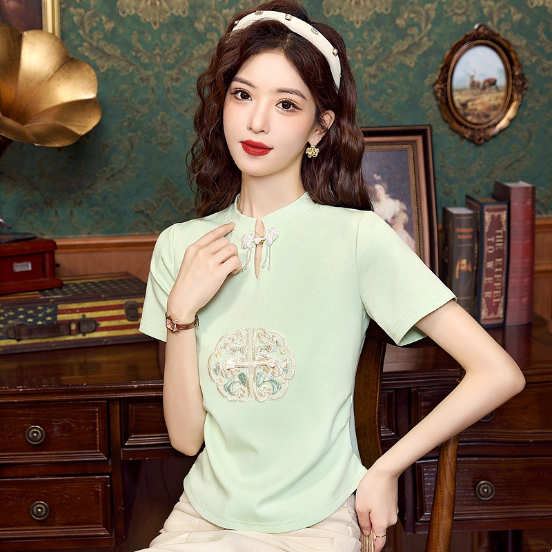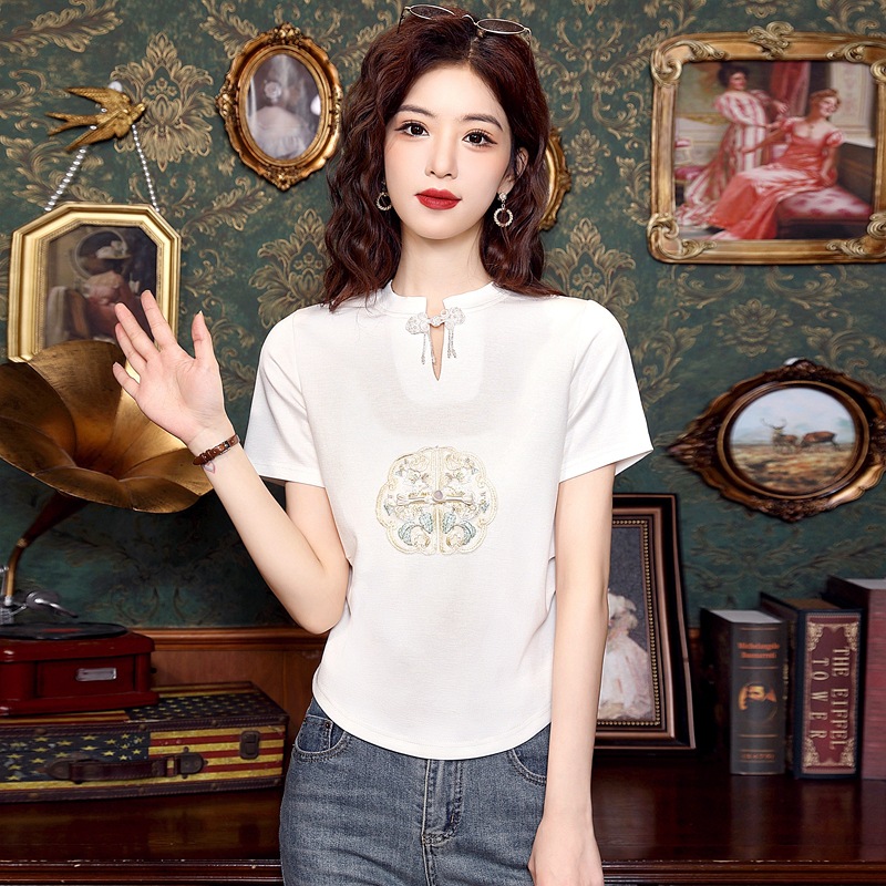 | nameOriginal | Design-Sense Embroidered Shoulder Short-Sleeved T-Shirt Women's Summer Slimming Flesh-Covering Collar New Chinese Style National Style Top |