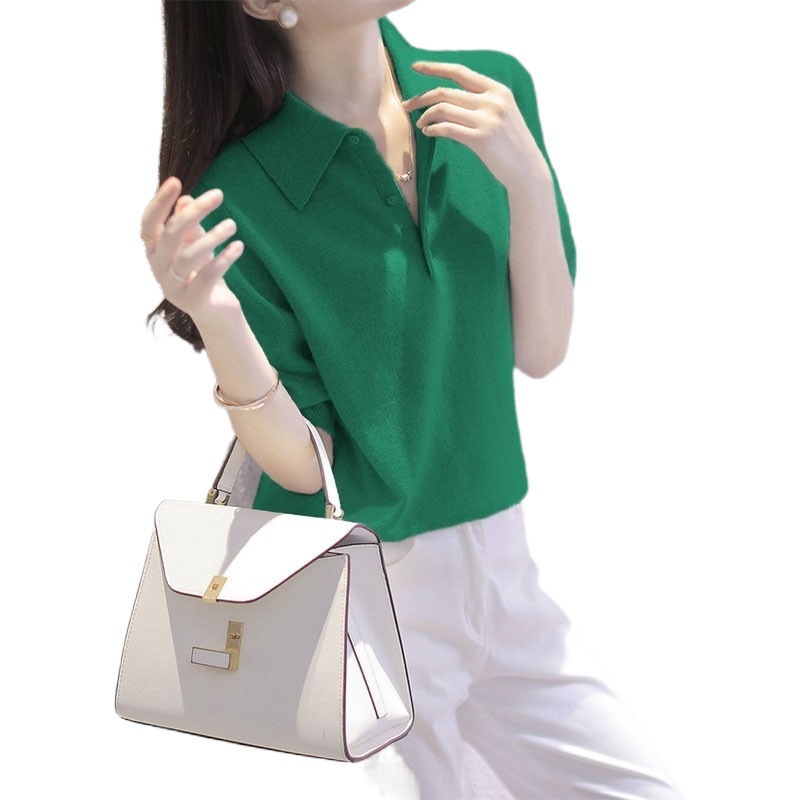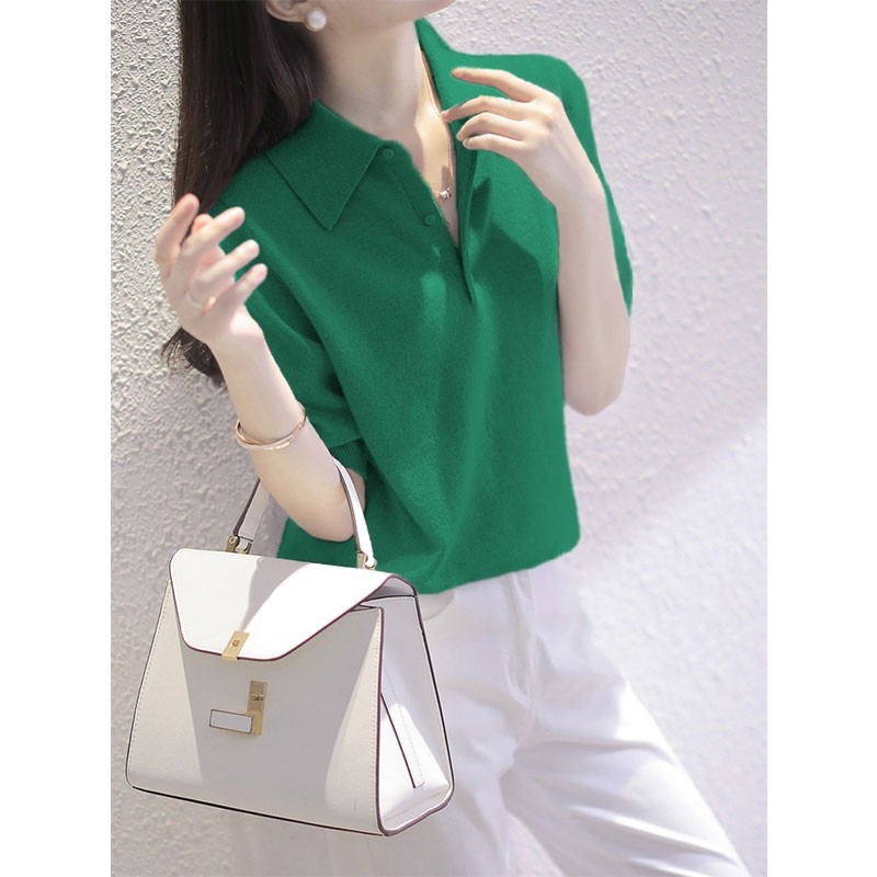 | nameOriginal | Summer elegant white short sleeve Ice Silk thin sweater women's POLO collar slimming niche design T-shirt top |
